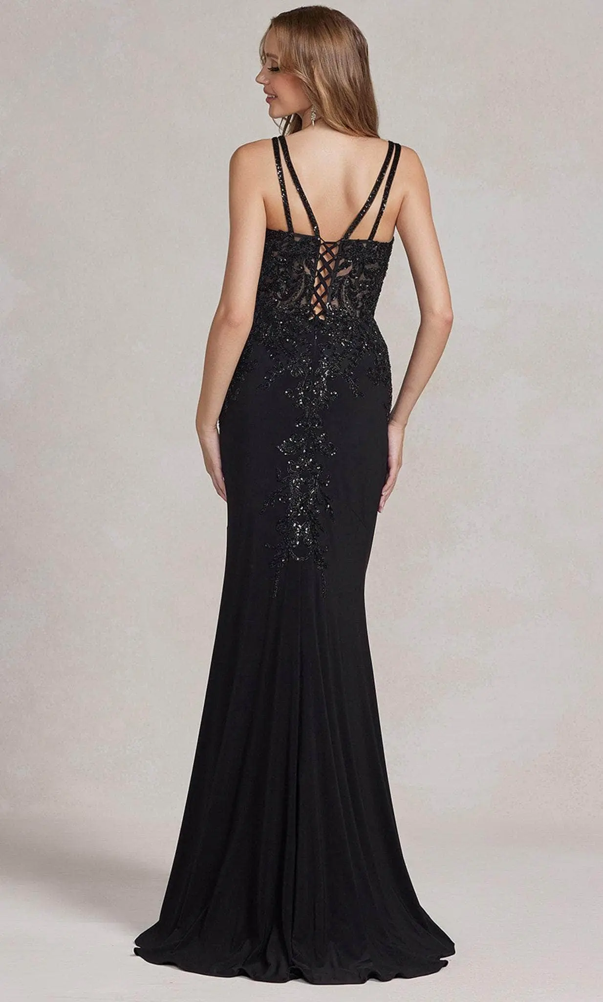 You are a mesmerizing goddess as you wear this Nox Anabel H1090. This lovely piece is stylishly feminine, with a sleeveless illusion fitted bodice embroidered with lace applique. The dress has a mid-open back with a lace-up tie for a perfect fit. The back of the skirt is secured with a center zipper closure and cascades into a stunning full-length and finishes with a sweep train. This fabulous Nox Anabel H1090 evening dress will make you the center of attention at your next formal event. Models are wearing Black and Red colors.