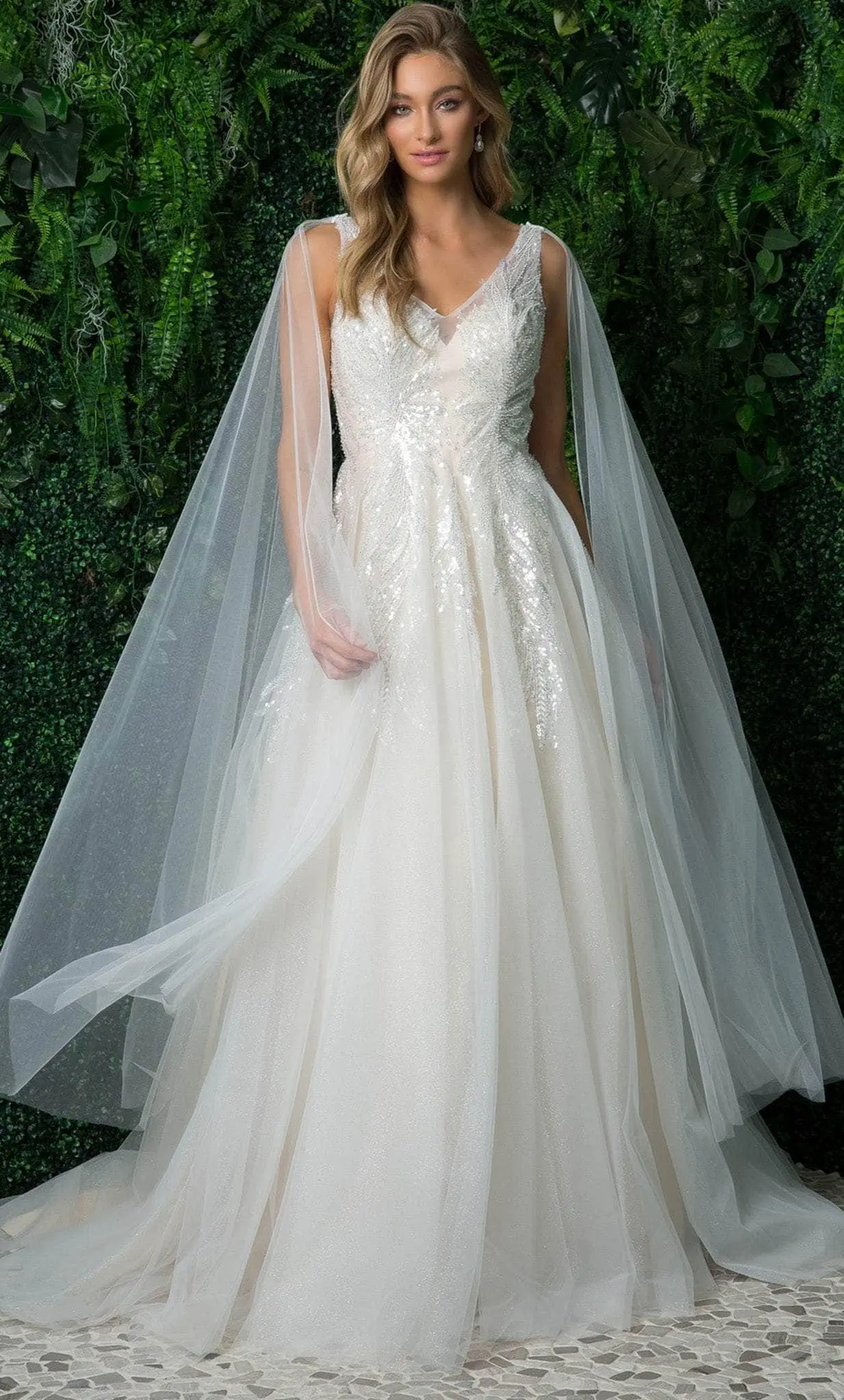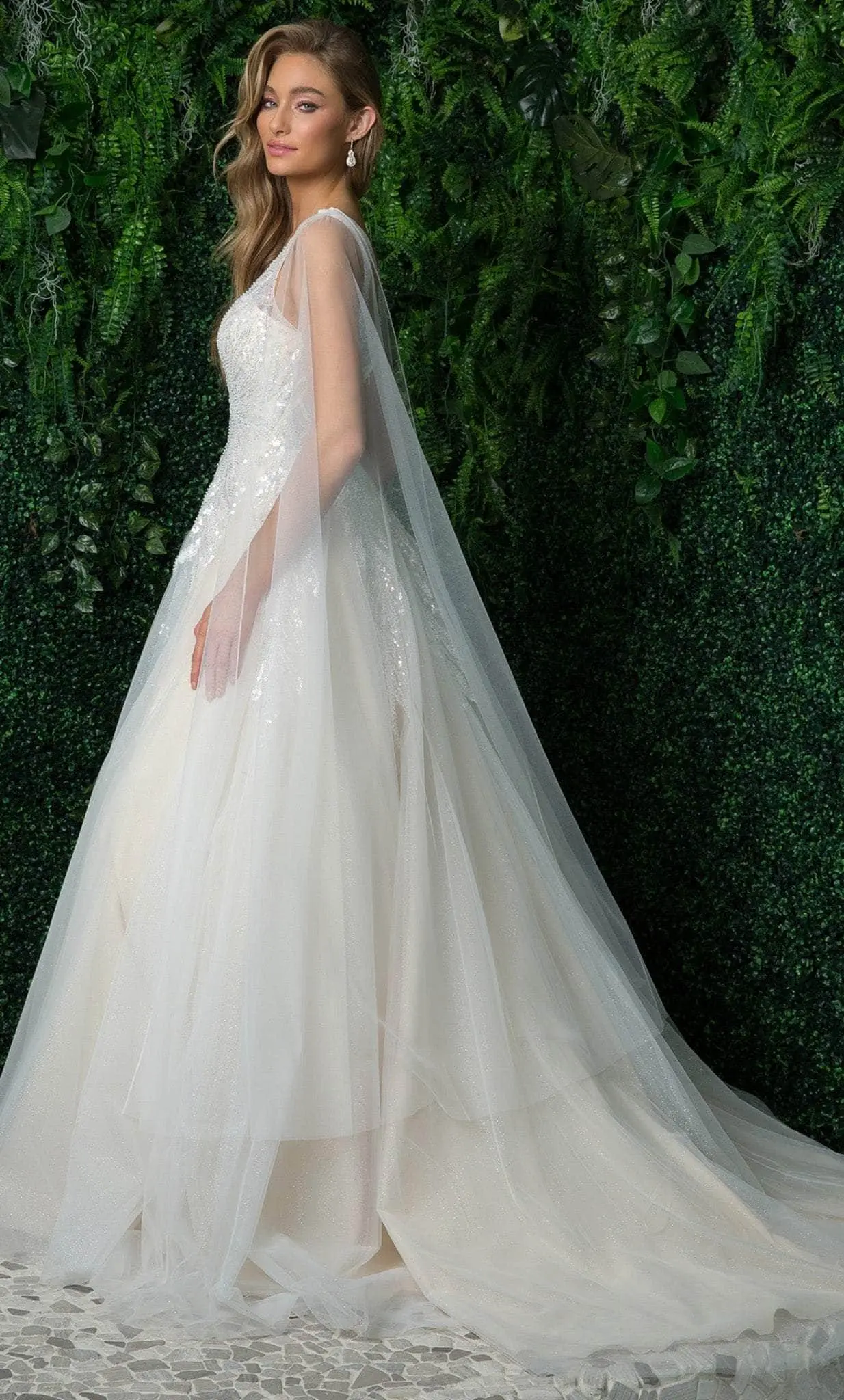 You’re certain to capture the hearts and attention of everyone at your wedding when you walk down the aisle in the glamorous Nox Anabel JE947. Soft and romantic in exquisite detailing of beads and sequins in the bodice, and features a V neckline and a scoop back. A floor-length tulle fabric is attached from the shoulders, which gives the gown a cape effect. The fit-and-flare dress has a skirt with an outer tulle fabric and cascades in a chapel train. This Nox Anabel JE947 is perfect for a traditional celebration or a lavish affair. Model is wearing White & Nude color.