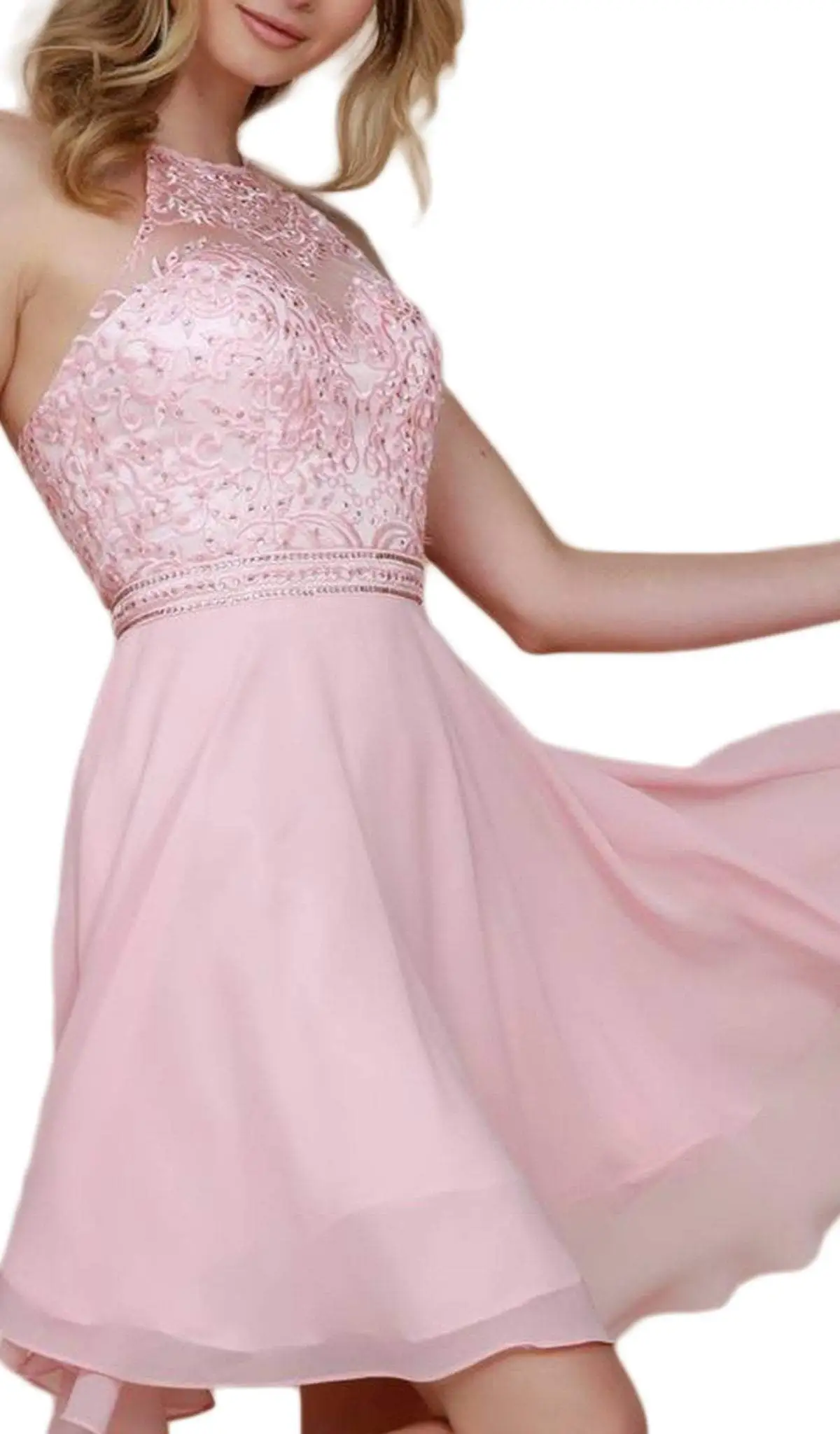 Show off your trendsetting style when you wear this look from Nox Anabel Y629. This cocktail dress features a sleeveless, illusion halter neckline with sweetheart lined bodice adorned with embellishments. Thin straps line the mid-open back while a chiffon A-line skirt runs at mid-thigh hem. Dress to impress with this design from Nox Anabel. Model is wearing Blush color.