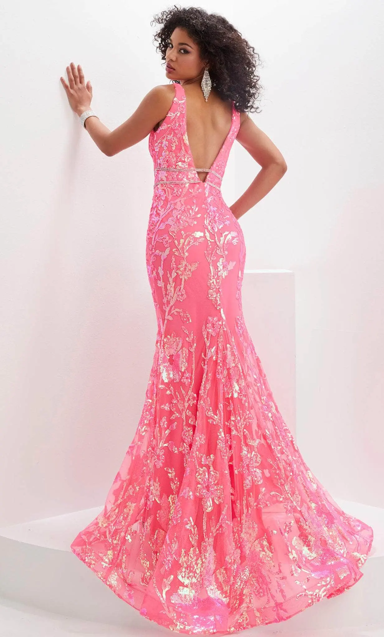 Inspire everyone to take a gander at your spectacular beauty in this glorious Panoply 14124 creation. Donning sculpting tailoring lines accentuating the ensemble, this stunner parades a floral sequined silhouette with a plunging v-neckline on a sleeveless bodice. Designed with a plunging v-open back and double thin straps. Opening with a sexy high slit, the mermaid skirt sculpts from the waist to the hips before flowing into a grandiose train. Shine amidst the upscale crowd in this stylishly made Panoply masterpiece. Models are wearing the Orange, Pink, and Yellow colors.