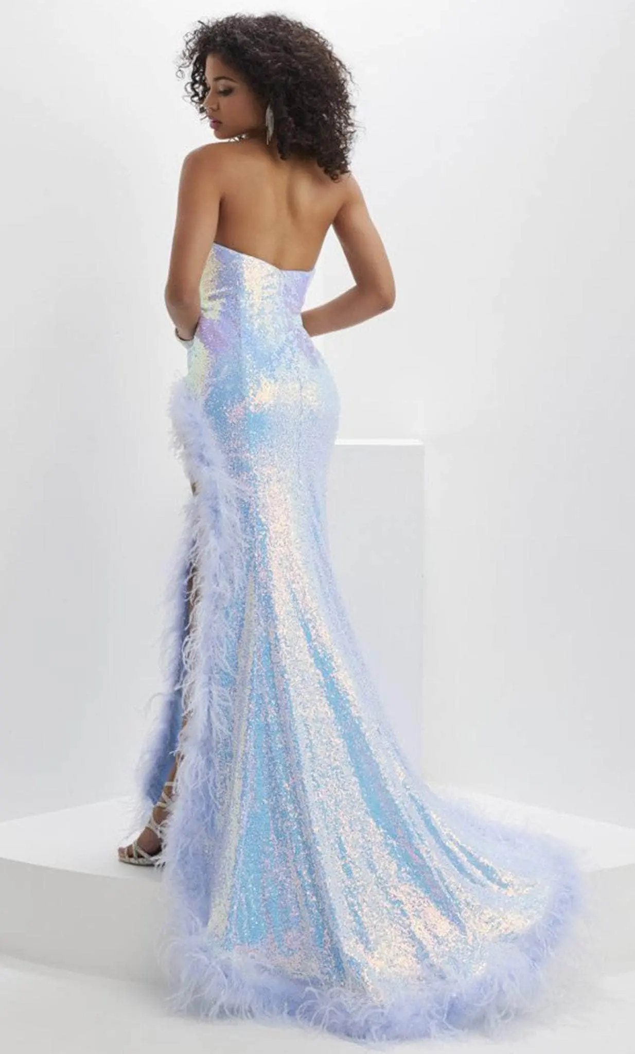 Radiate pure class in this stunningly chic Panoply 14147 masterpiece. Showcases a strapless bodice with a plunging sweetheart neckline and a mid-open back, this gown is eye-catching with the iridescent sequins embellishment throughout. For a flirty and playful look, the full length trumpet skirt is accented with feathers trim on the thigh-high slit and sweeping train. This Panoply 14147 gown is awesome for prom or for any special night event! Model is wearing the Sky color.