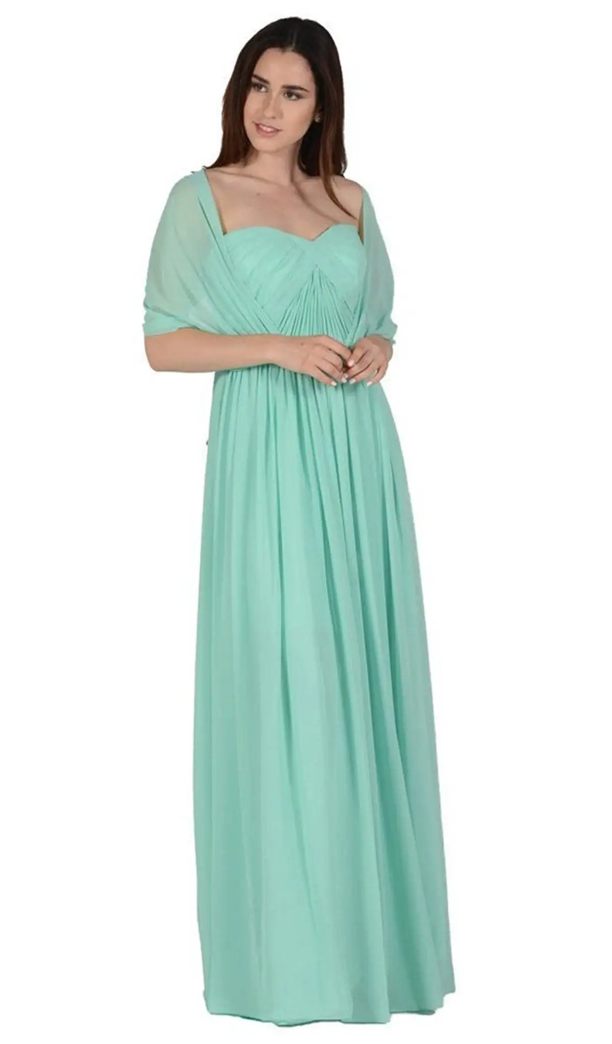 Waltz into the party and show off your trendsetting style with this convertible chiffon dress from Poly USA 7156. Features a strapless sweetheart neckline. Explore your creativity with its long panels form the waist can be artfully wrapped and tied over the bodice to create more than 10 different elegant looks. The skirt opens in an A-line silhouette and runs at full length hem. Get on the best-dressed list in this fabulous look from Poly USA.
