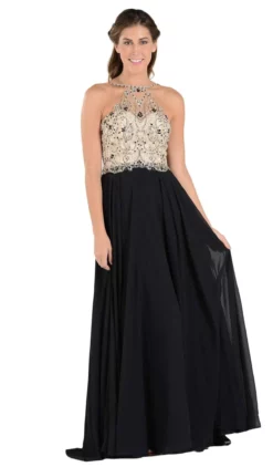 Charm everyone with your stylish flair as you make such a dramatic entrance in this Poly USA 7826 creation. Festooned with faceted jewels on a sheer cut-in bodice, this gorgeous piece flatters an illusion halter neckline paired with a low v-cut open back. The chiffon A-line skirt softly flows immaculately down to a sweep of train. Be the belle of the ball when you glam up in this formal Poly USA masterpiece.