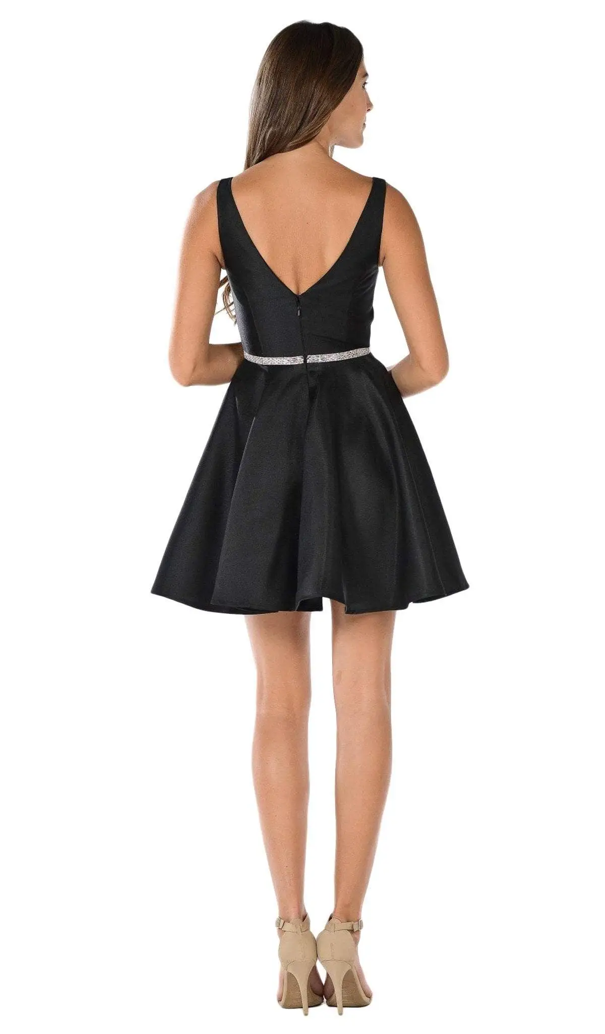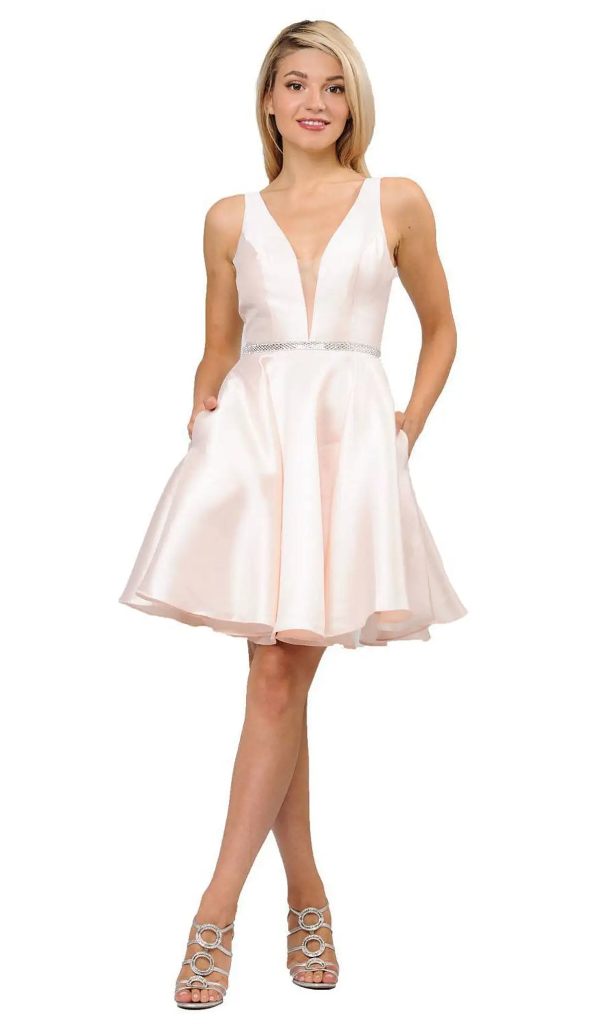 Promote attention-grabbing style in this stunning dress by Poly USA 7894. Features a sleeveless, deep V-neckline with sheer inset. The bodice is cinched in an embellished belt and flaunts a V-back with a zipper closure. The skirt flows in an A-line silhouette and runs at mid-thigh hem. This Poly USA creation is simply captivating!