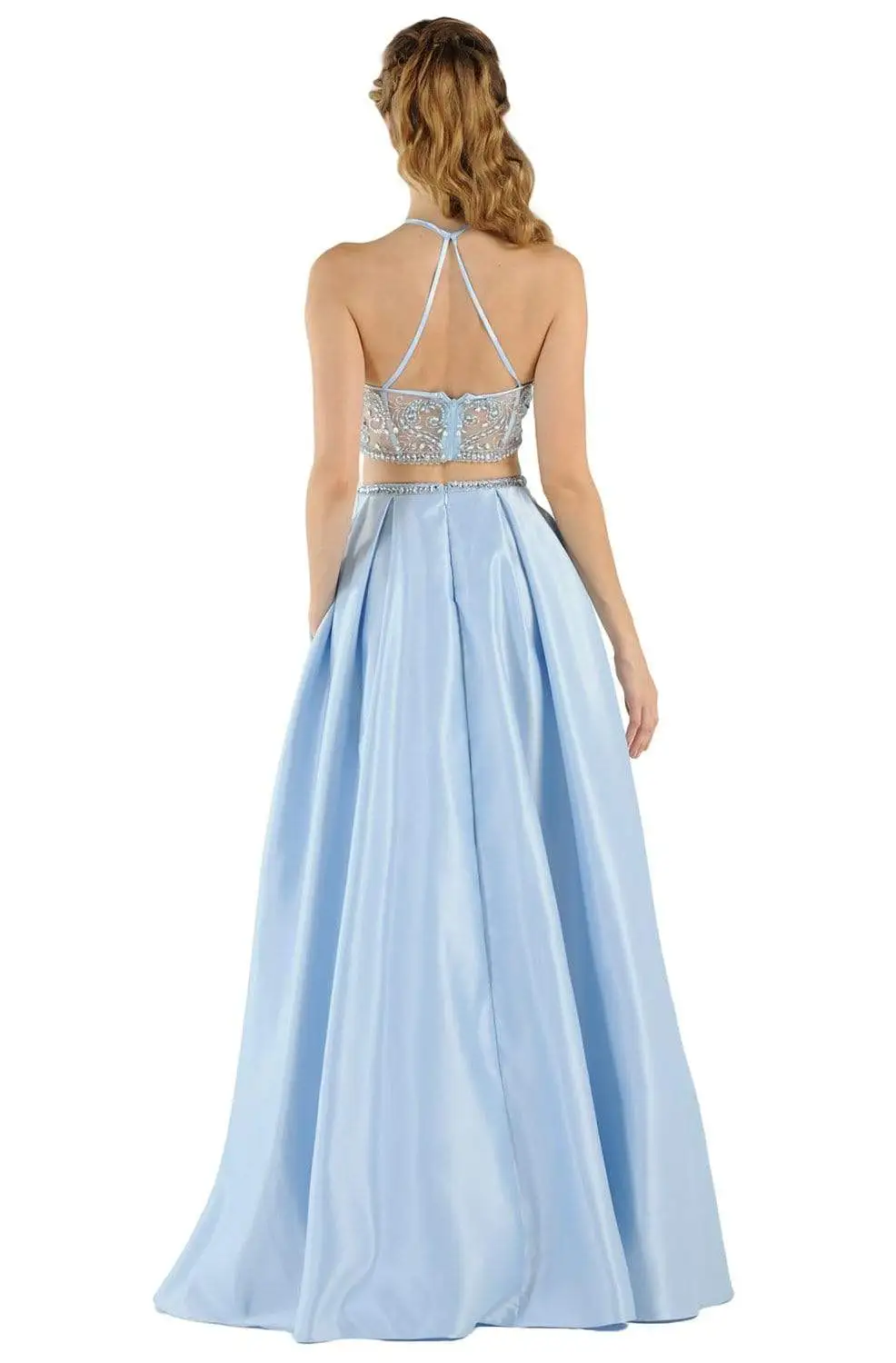 Wrap yourself in timeless allure in this Poly USA 8210 creation. Exquisitely embellished with beadwork on a mesh bodice, this two-piece dress reveals an illusion halter neckline with a strapped mid-open back. Jewels ornate the waistband as the pleated satin skirt cascades into a sweep of train. Make all eyes gravitate towards you in this Poly USA masterpiece.