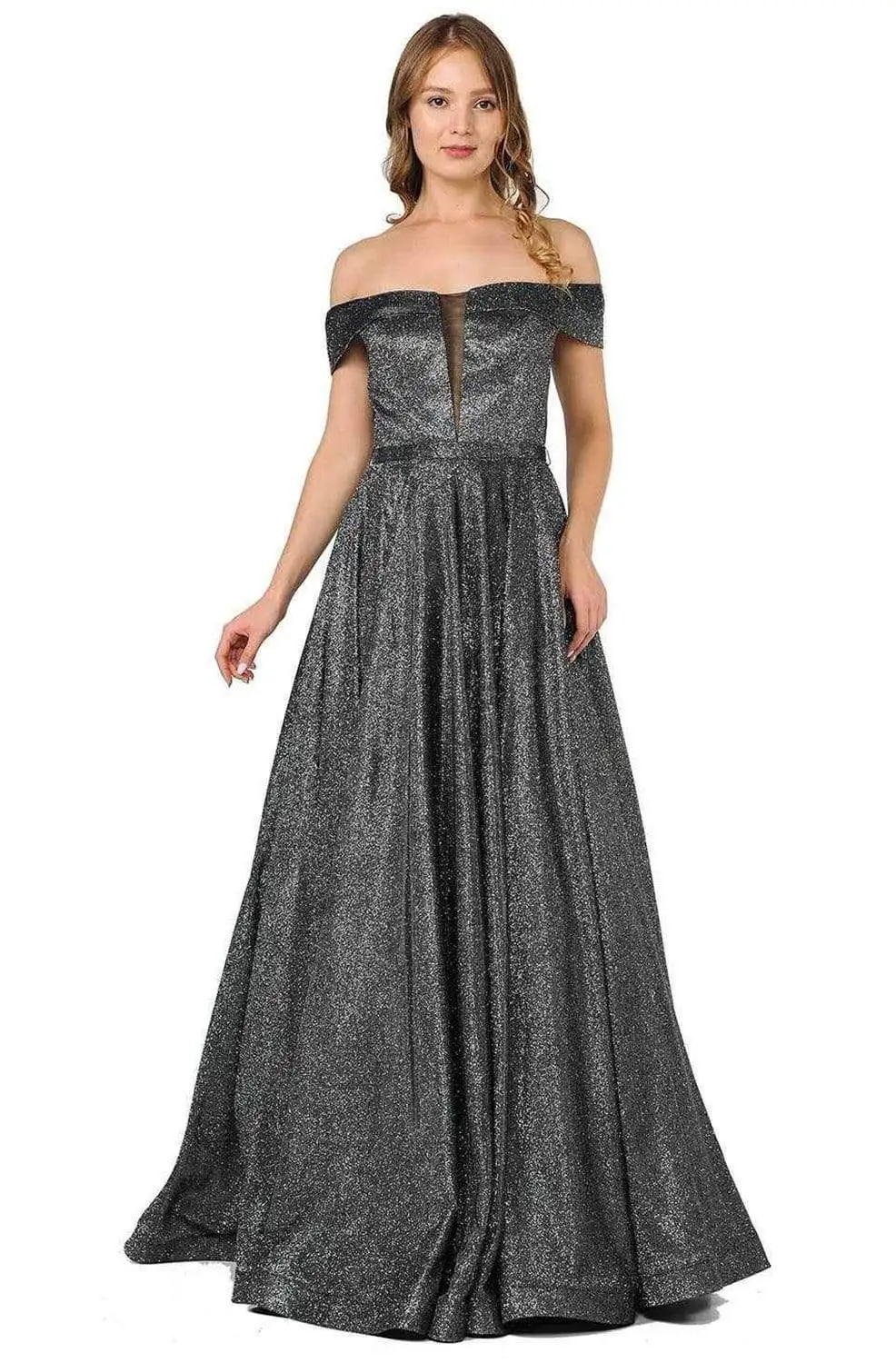 Draw out the princess in you with this spectacular gown by Poly USA 8464. This charming piece is tailored in glitter knit fabric, features a split off-the-shoulder neckline with mesh inset and a fitted bodice. From the natural waist with tonal piping, begins a voluminous skirt forming that perfect princess effect. Get noticed in any crowd wearing this iridescent gown from Poly USA.