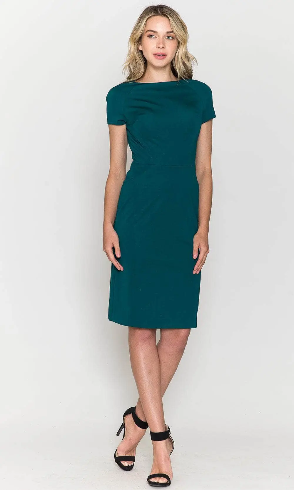 Capture that striking presence and get everyone’s attention in Poly USA 8774. This sophisticated dress is tailored from jersey fabric and crafted with clean seams to emphasize your curves. It exhibits short sleeves paired with a fully enclosed back that is secured with zipper closure. The skirt boasts a sheath silhouette in a knee-length hem that adds flair to this charming dress. Look fashionably chic and fabulous in this formal cocktail dress by Poly USA 8774. Models are wearing Navy, Emerald and Black color.