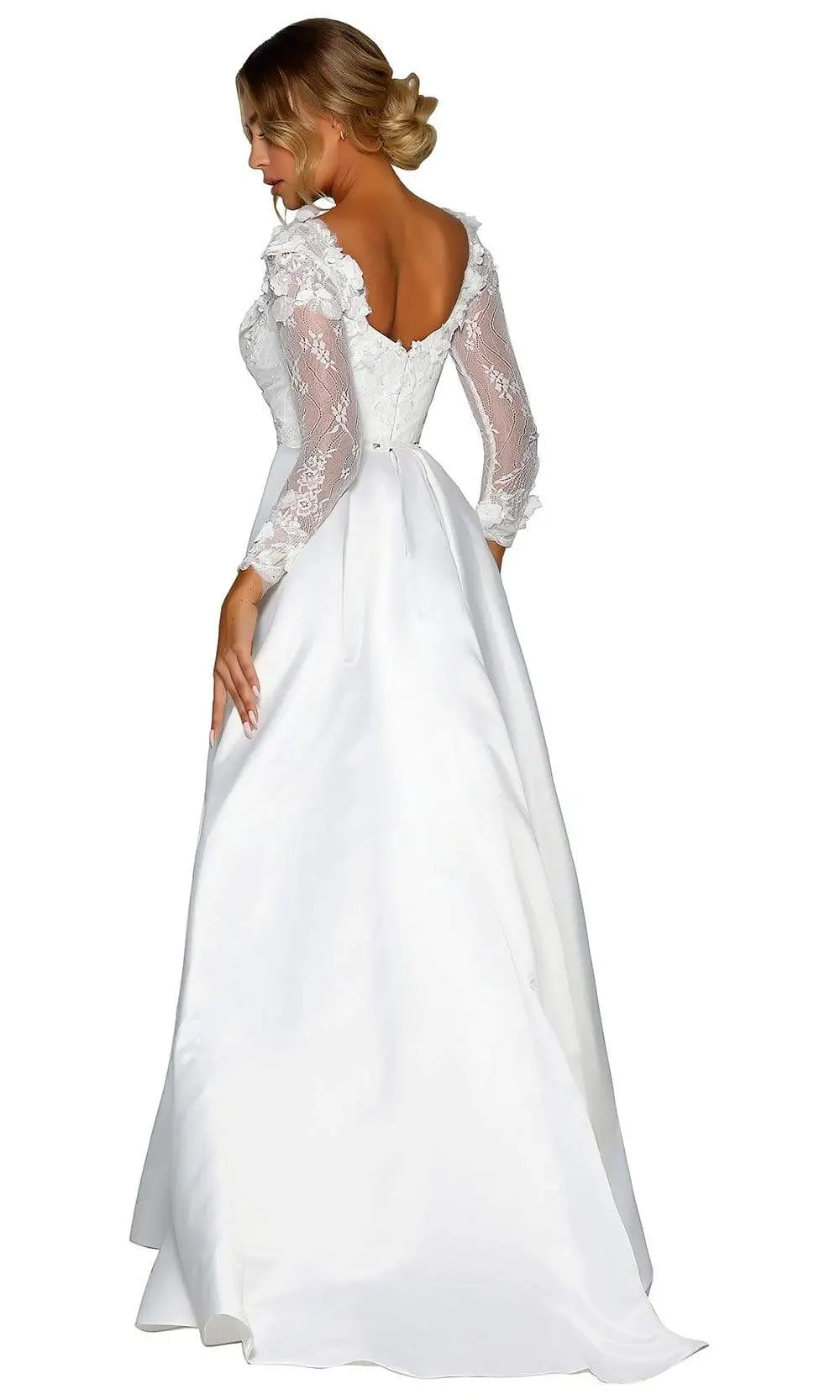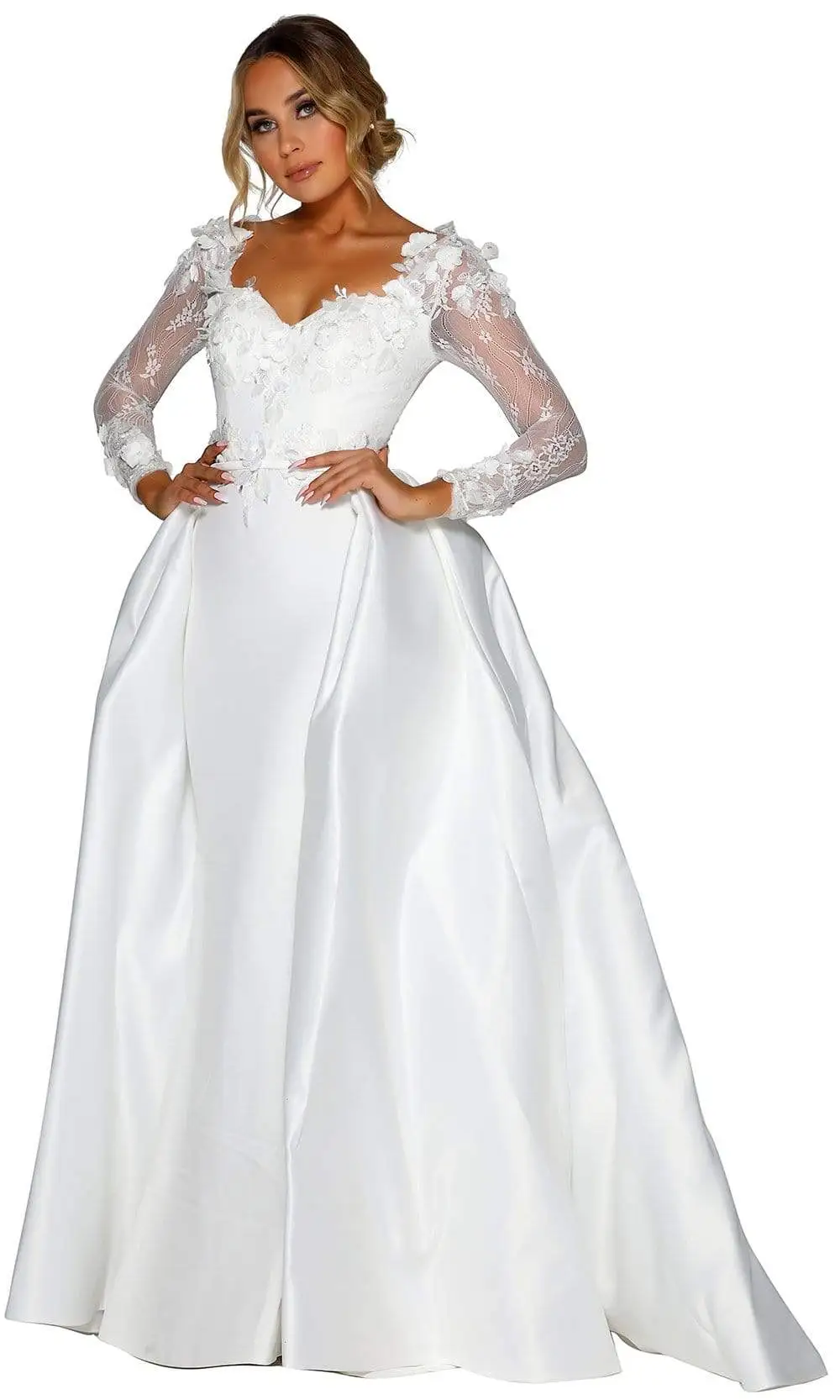 Show up in this design by Portia and Scarlett PS1906S. This embroidered lace gown features a sweetheart neckline with sheer long sleeves. The dress has a fitted bodice and from the waist begins a ballgown skirt. This Portia and Scarlett gown is sure to be an attention-grabber in any occasion.