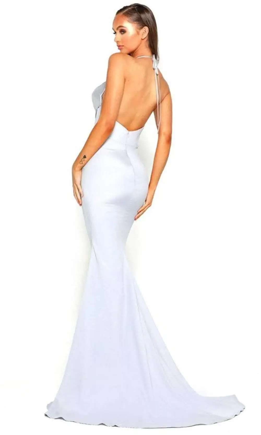 | Details: | Fabric: Silk and Crepe fabric 95% Polyester, 5% Spandex. Stretch Polyester lining Sleeveless, Braided pleated bodice, Low-cut open back, Fit and Flare, High leg slit, Sweep train, Hidden back zipper |