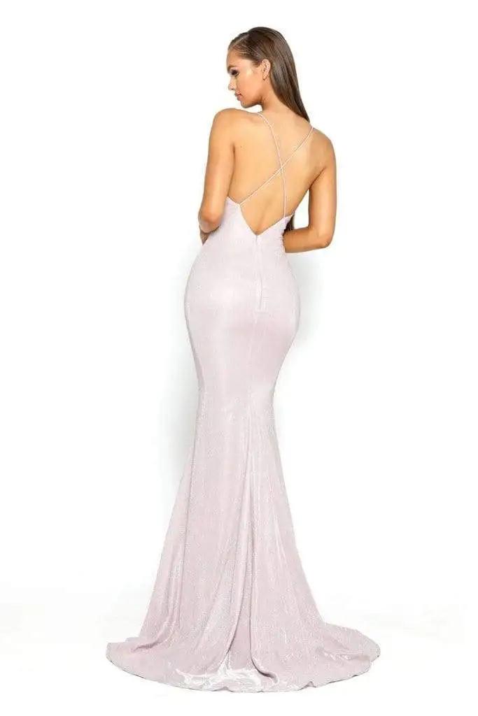This Portia and Scarlett PS1936 dress is sure to turn heads at any occasion. This glitter dress glams in a sleeveless, cowl neckline with spaghetti traps. It has a fitted bodice and criss crossing straps. The skirt is tailored in a fit and flare silhouette and finishes in a sweep train. This Portia and Scarlett dress is designed to hug the body in all the right places.