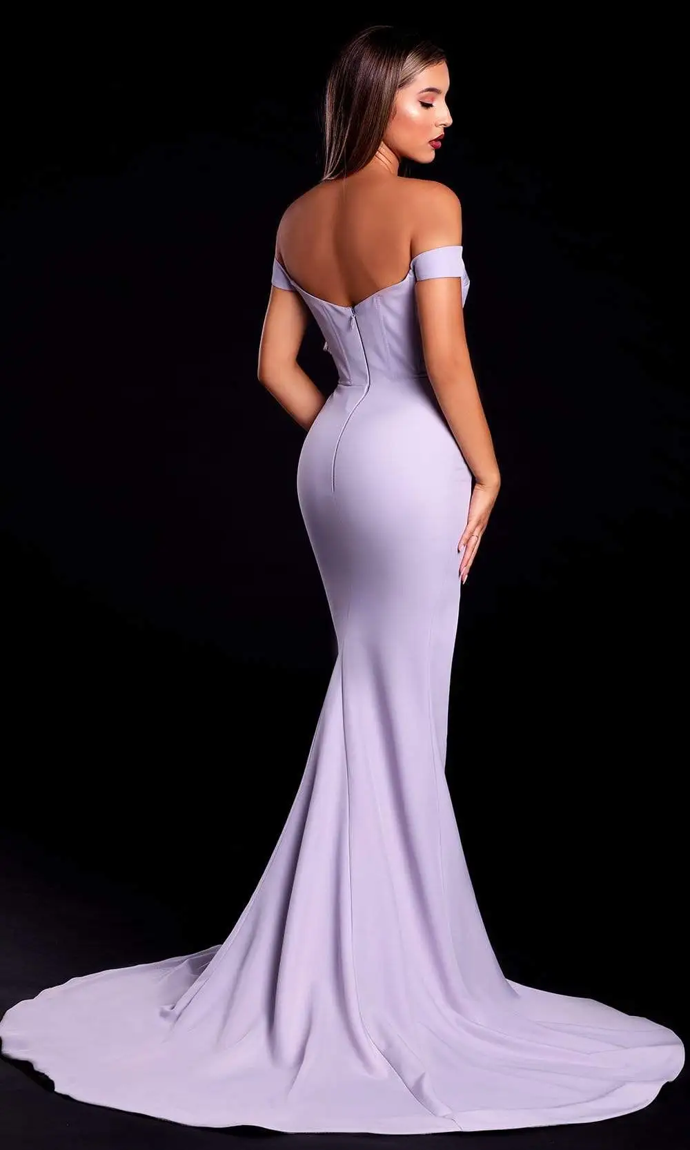 Inspire endless fascination among the crowd in this sublime gown by Portia and Scarlett PS21045. A full-length solid jersey gown crafted in a flattering fit and flare silhouette features a corset style fitted bodice with bustier off-shoulder neckline, mid-open back, form-fitting hips and a thigh-high slit. The gown finishes with a court train. Make the crowd long to embody your classic style in this elegant Portia and Scarlett long special occasion dress.