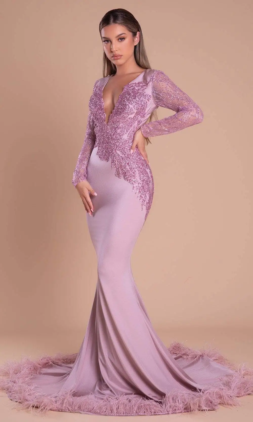 Heighten your charming appeal in this figure-flattering Portia and Scarlett PS21139 evening dress. A plunging V neckline and long sleeves frame the glitter appliqued bodice, complemented with an open back. Feather accents design the hemline and train of the mermaid silhouette. All eyes will be in you with this Portia and Scarlett creation.