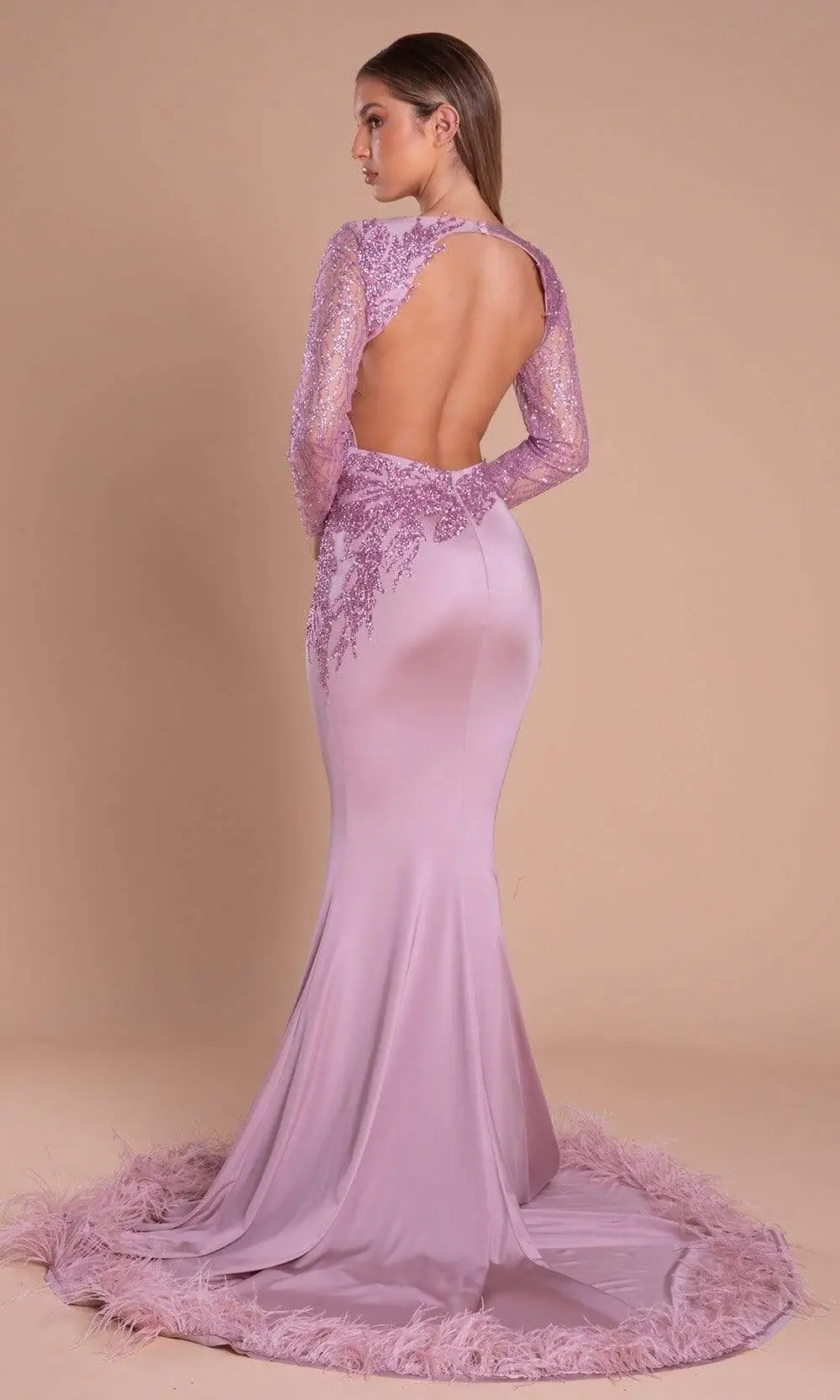 | Details: | Glitter Appliques, Fitted, Long Sleeves, Feathered Hemline, Floor Length, Cut Out Open Back |