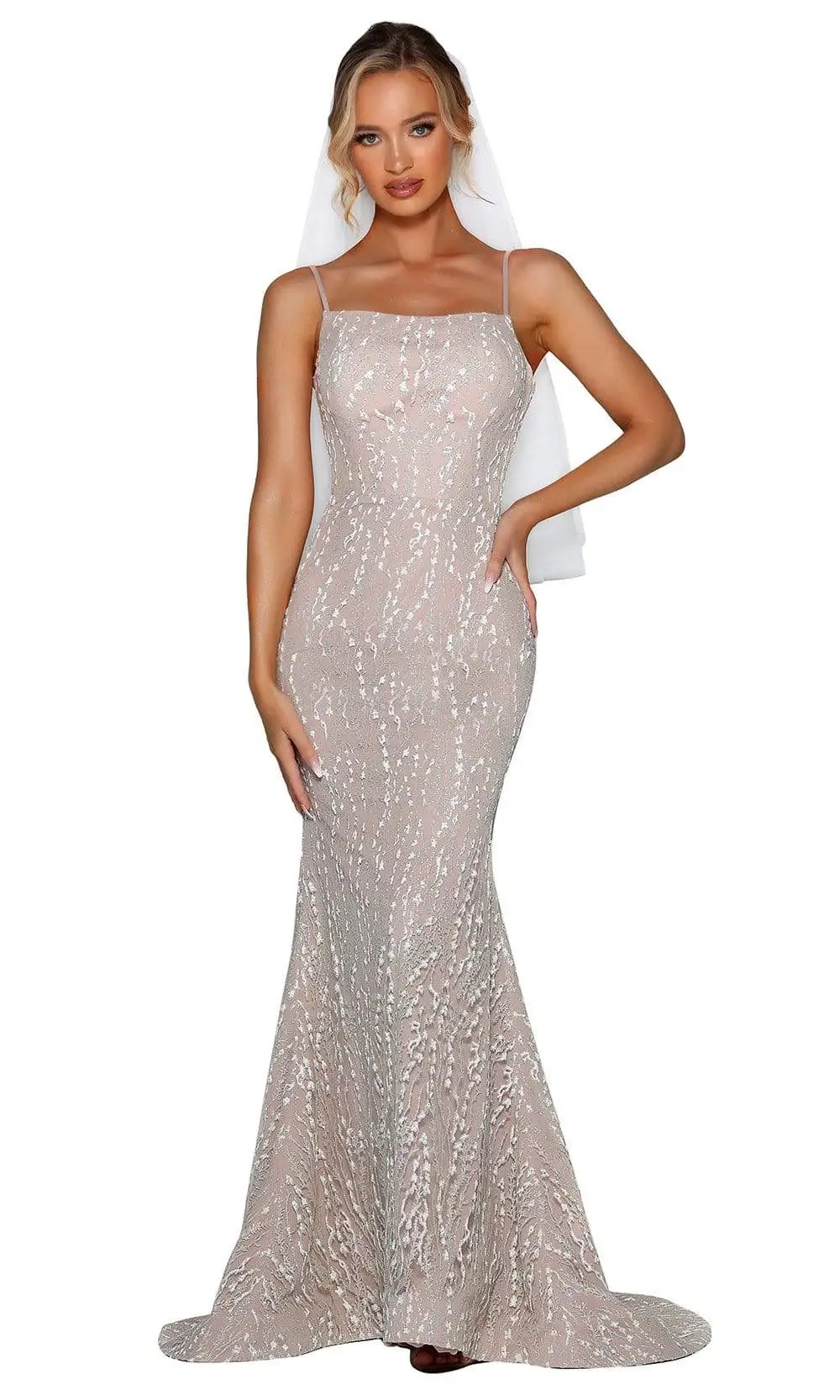 Class and sophistication are achieved in this stunning design by Portia and Scarlett PS6429. Featuring a straight across neckline, thin straps add a sense of comfort. Sparkling cracked glitter detailing design the whole silhouette illustrating a phenomenal embellishment that is the epitome of perfection. The stunning dress accentuates your figure strikingly, while the sophisticated sweep train adds an eye-catching effect. Perfect for Prom, Military Ball, or as part of wedding entourage – you will be a real darling in this Portia and Scarlett dress!