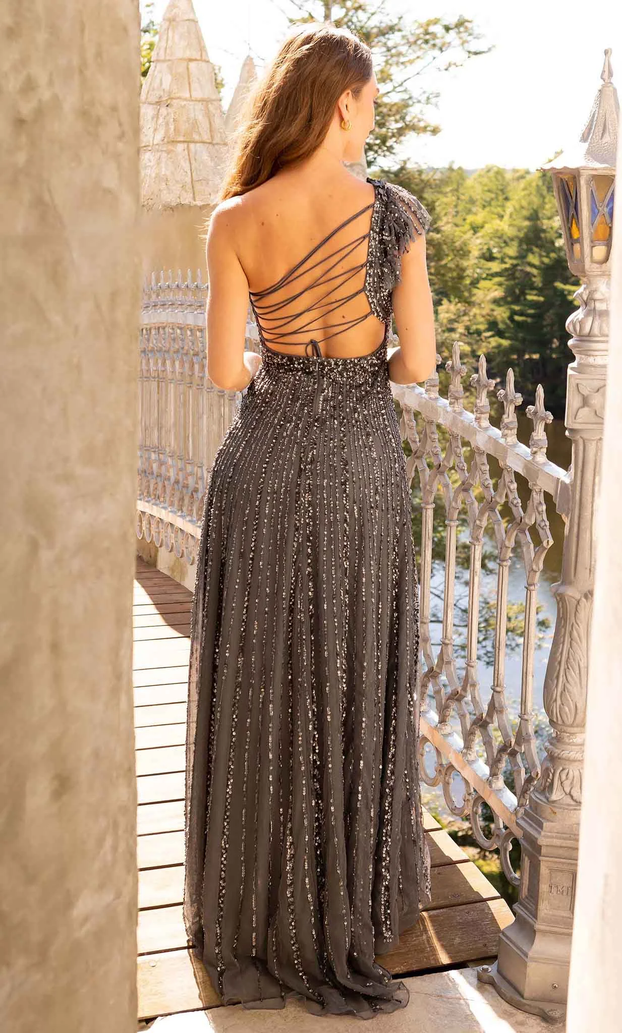 Enter the hall with grace and beauty in Primavera Couture 12003. Walk in a dreamy dress that is made from a fabric that has airy weight and flowy feeling. Highly embellished with beads in a diagonal pattern while it opens in an asymmetric neckline. Back is detailed with number of straps while showing your skin. This Primavera Couture 12003 is the perfect prom dress for the girl who wants to stand out from the crowd while looking glamorous. Model is wearing Charcoal color.