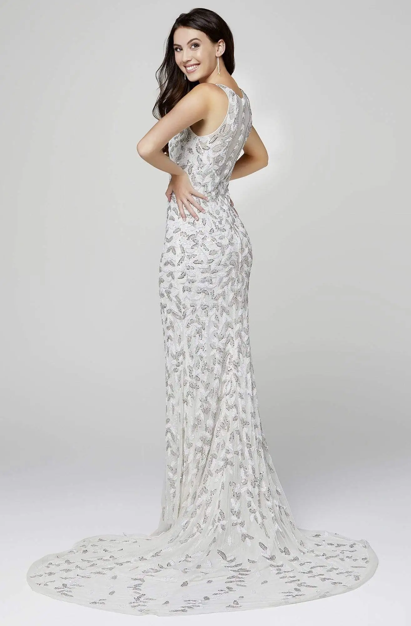 You are sure to be the life of the party when you are wearing this dazzling Primavera 3384. Tailored with a plunging V-neckline, this sequined beauty features bead details all over the dress, fully covered back with sheer details, and a zipper closure. The sheath silhouette skirt completes the look, with a court train. Get ready to shine in this fabulous Primavera Couture creation.