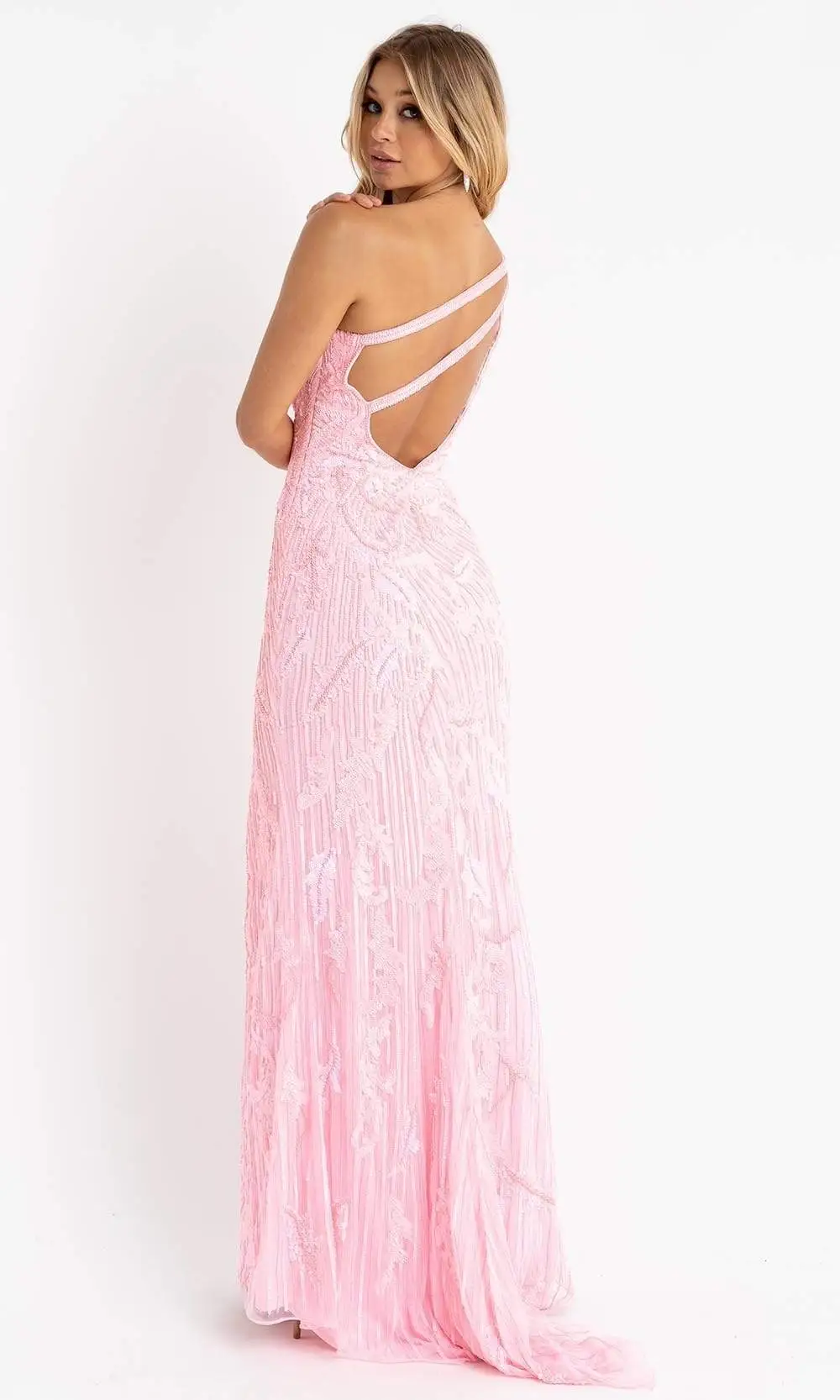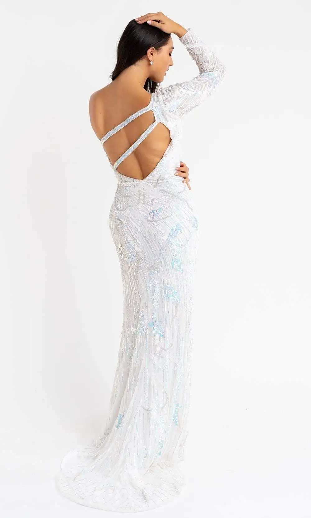 Appear with defined sophistication in this trendy evening gown by Primavera Couture 3759. This dress is completely beaded and has a fitted bodice with an asymmetrical neckline and an embellished mesh single shoulder long sleeve. The open back is secured by a concealed  center zipper and features a double asymmetrical strap. The sheath skirt, with its high side slit, accentuates your form and finishes a brush train. Have a blast at your special event with this Primavera Couture creation. Primavera Couture’s sparkling long sequin dresses and cocktail dresses will dazzle you with compliments as these dresses are extremely impressive.