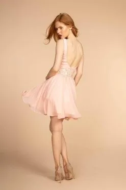Elizabeth K – GS1617 Deep V-neck Floral Applique Chiffon A-line Dress