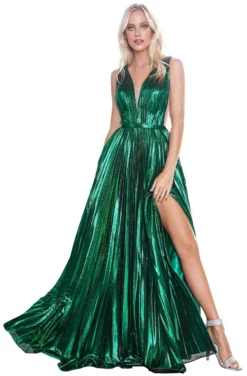 Cinderella Divine – CD160 Deep V Neck High Slit Metallic Pleated Gown