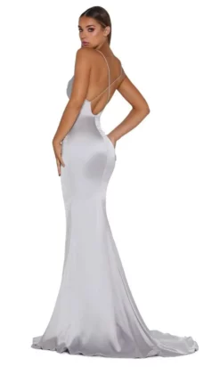 Poly USA – 8182 Plunging V-Neck Bejeweled Bodice Satin A-Line Dress