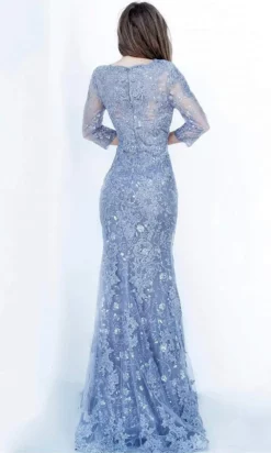 Jovani – 02444 Floral Embroidered Lace Deep V-neck Trumpet Dress