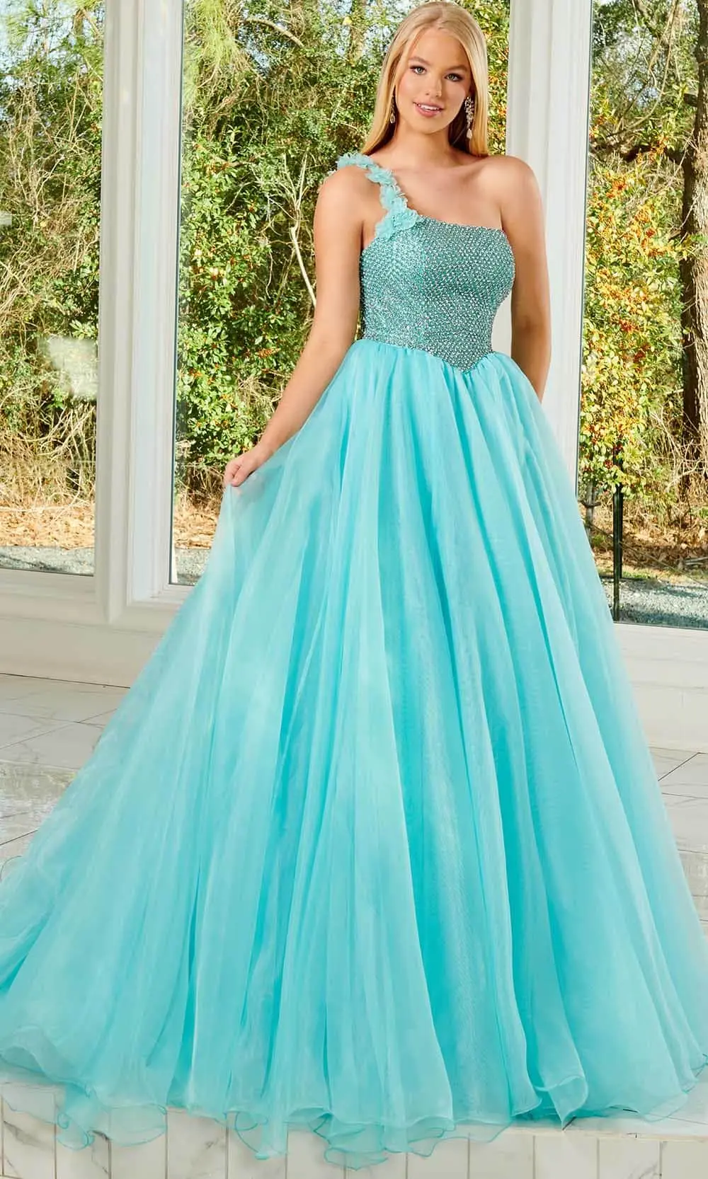 Step out in style wearing this fancy evening gown by Rachel Allan 50156. The sleeveless bodice is elegantly adorned with sparkly jewels in an asymmetrical neckline supported by a single shoulder strap with floral applique details. Contoured with princess seams to accentuate the curves while the back splashes a bit of skin with zipper closure. Defined in a basque waist, the ballgown silhouette skirt cascades into a court train. A separate cape is included for added drama. Leave them astounded as you walk with poise in this Rachel Allan masterpiece. Models are wearing Aqua and Fuchsia colors.