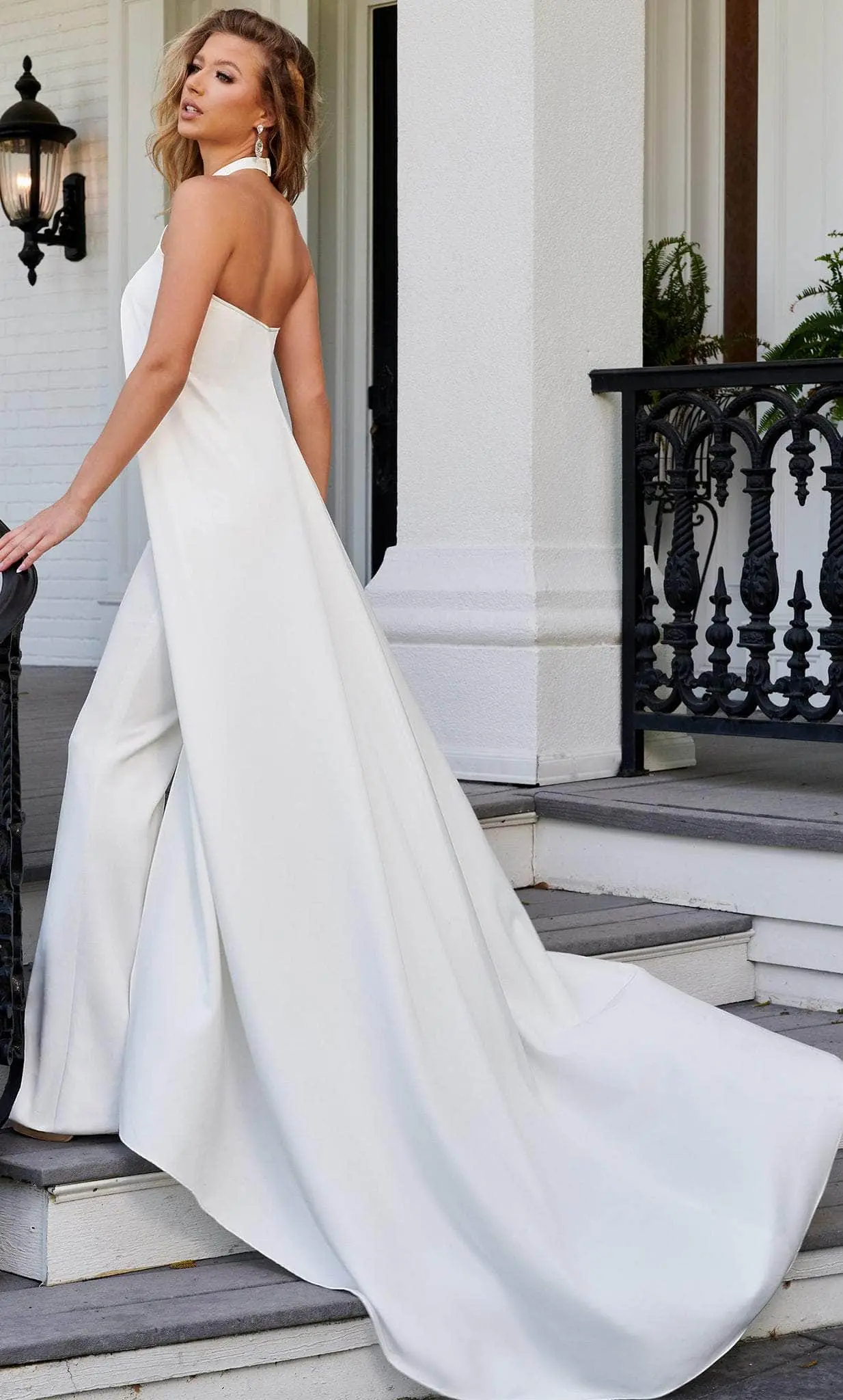 Earn your place in the limelight in this ahh-inspiring evening gown by Rachel Allan 50179. Showing off a unique three piece style, this stunning jumpsuit opens with a regal cape-like detail with crossed halter neck style. The inner bodice glitters with chunky, multicolored sequins, offering a simple straight across neckline and a slightly exposed midriff. The pants are simple and elegant in satin, tailored to fit the curves and ending in a flared leg style. Capture pure elegance in this classy Rachel Allan 50179. Models are wearing Royal and White Silver colors.