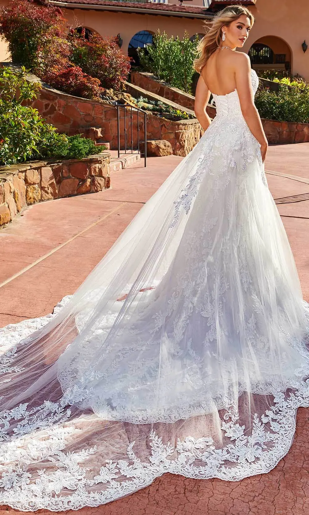 | Details: | Strapless, Plunging Sheer Inset, Beaded, Lace Applique, Detachable Overskirt, Tulle Bolero Jacket, Mid-Open Lace-Up Back, Scallop Hem, Chapel Train |