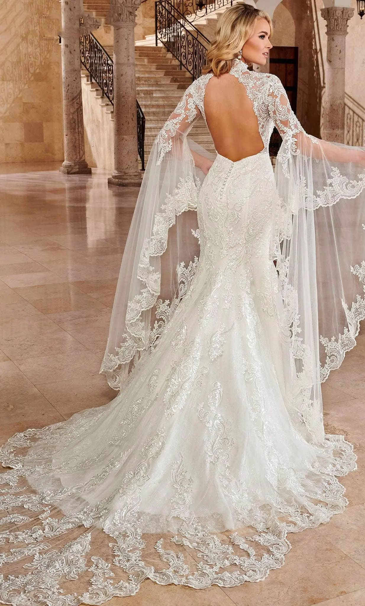 | Details: | Turtleneck, Sheer fabric, Flutter sleeves, Embroidery, Bridal, Open back, Back buttons, Chapel train |