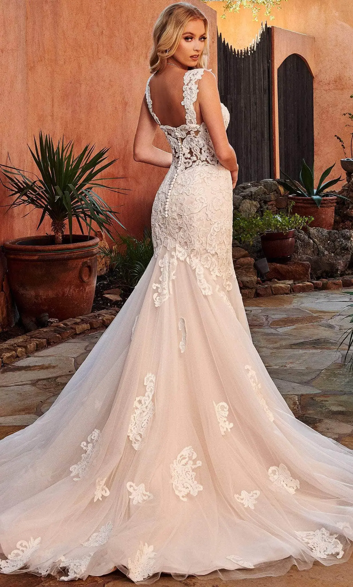 Experience a captivating entrance into the chapel adorned in the resplendent Rachel Allan RB5006 wedding gown, embellished with romantic beading and crafted from exquisite tulle fabric, exuding a fluid and immaculate aura. Intricately designed with lace applique and delicate beadwork, this gown is fashioned with an illusion bodice featuring a charming sweetheart neckline and adorned with button detailing at the back. The trumpet silhouette gracefully flares into a long and lavish skirt, culminating in a stunning chapel train. Rachel Allan RB5006 is the quintessential choice for the modern-day bride, evincing an unparalleled sense of style that transcends time. Model is wearing Ivory Champagne color.