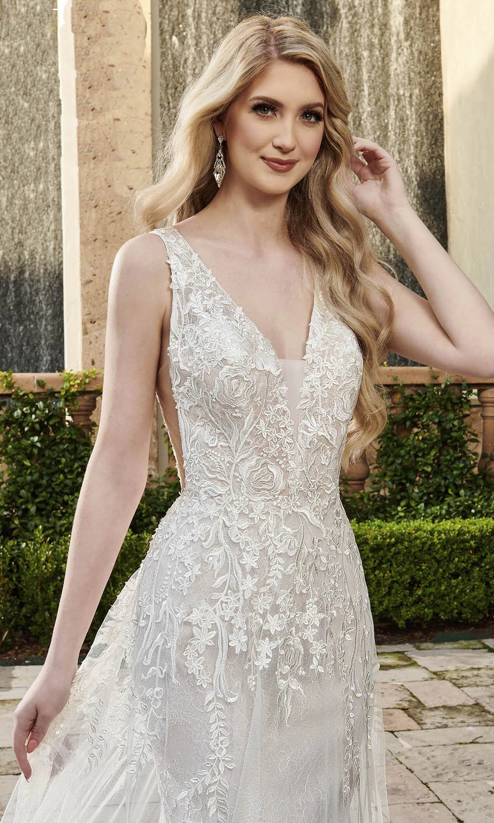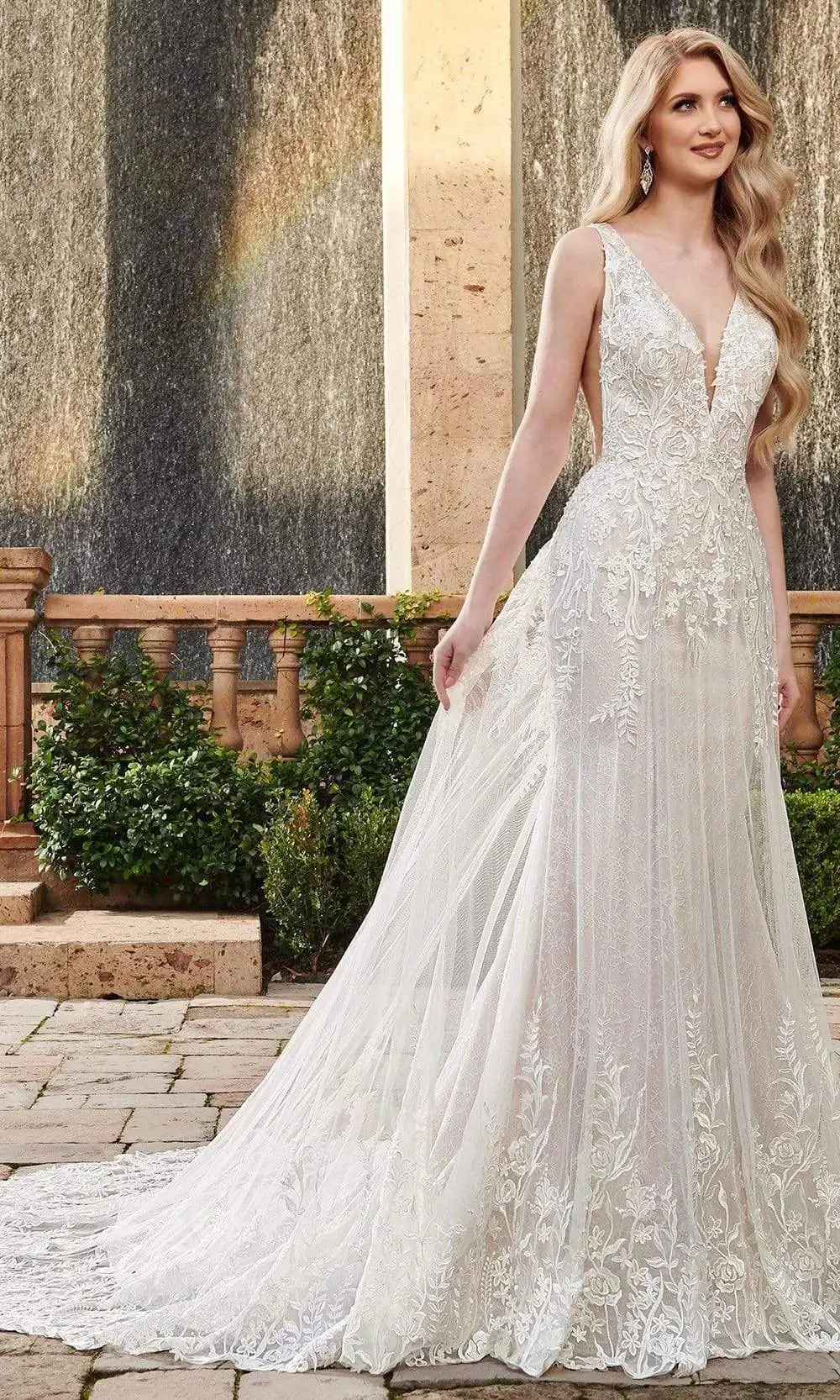 | Details: | Sleeveless, Sheer panel, Fit and flare, Floral, Embroidered, Plunging neck, Soft tulle, Lace, V back, Back zipper, Floor length, Chapel train |