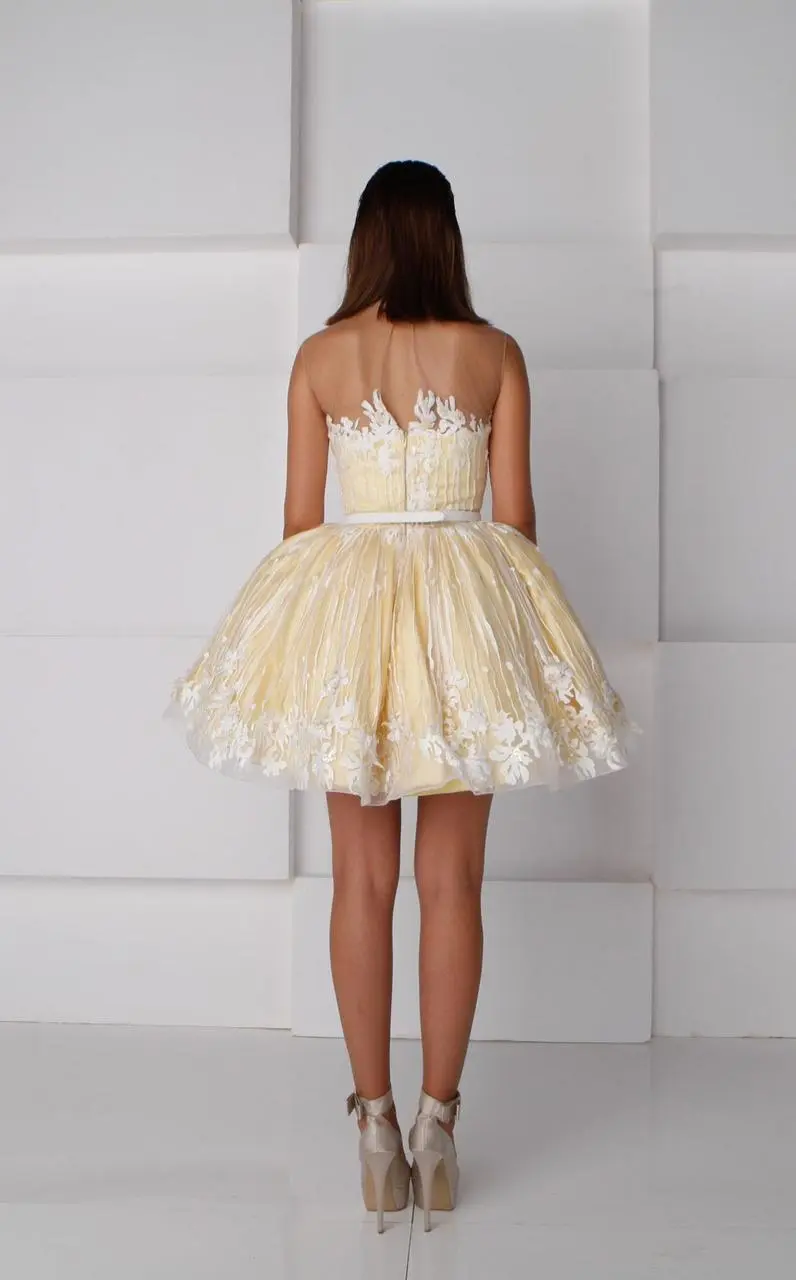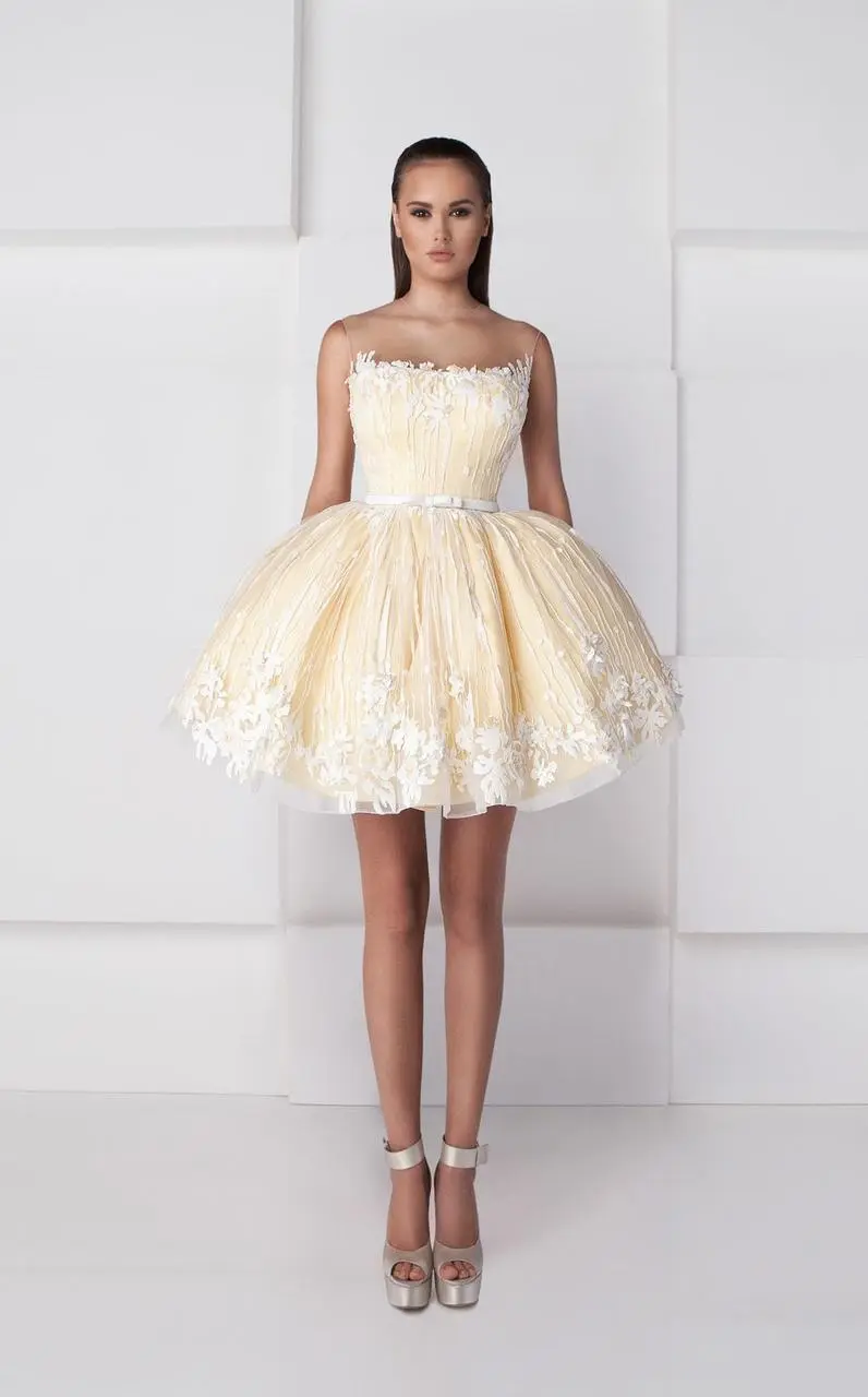 Radiate vibrant beauty and fascinatingly elegant vibe in this intricately rendered Saiid Kobeisy RE2751 creation. Ornate with stylized floral appliques on its entire sheer silhouette, this lovely piece showcases a jewel illusion over a straight-across neckline and a keyhole cutout back. Crowned at the waist with a bow accented slim band, the layered tulle skirt exudes volume and drama as it flares to a spectacular short hem in a frothy style. Be the belle of the ball in this highly captivating Saiid Kobeisy masterpiece. Model is wearing the Sunlight color.