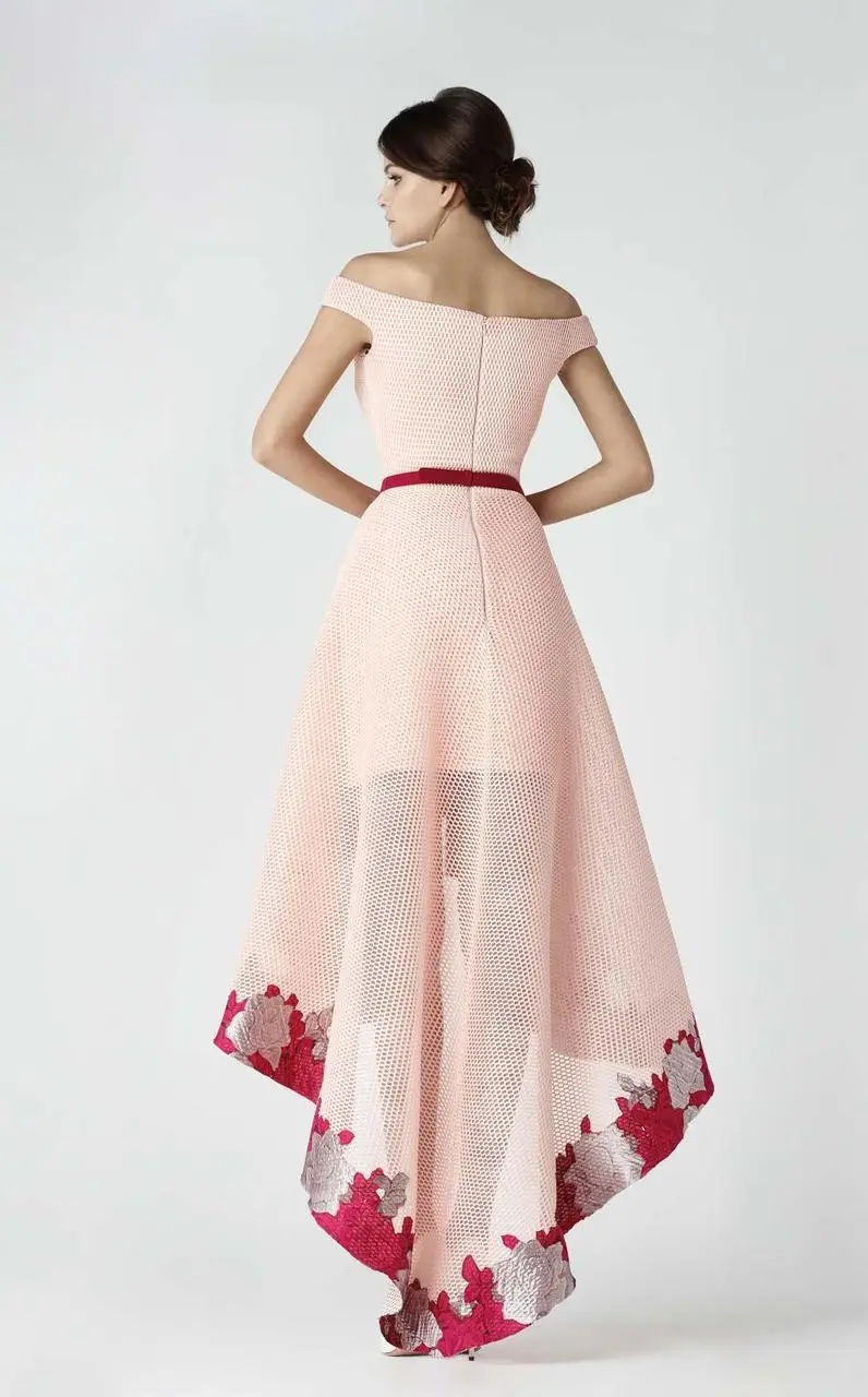 Get glamorous look with this evening dress by Saiid Kobeisy RE2917. The extravagant bodice has classic off the shoulder straps and is covered at the waist with a pleasing contrast bow. Shaped from stylish mesh, this astonishing ensemble drapes to the gorgeous high-low silhouette hem in fresh, flowing waves, embroidered with lovely floral appliqued details. This Saiid Kobeisy will absolutely make you feel special!