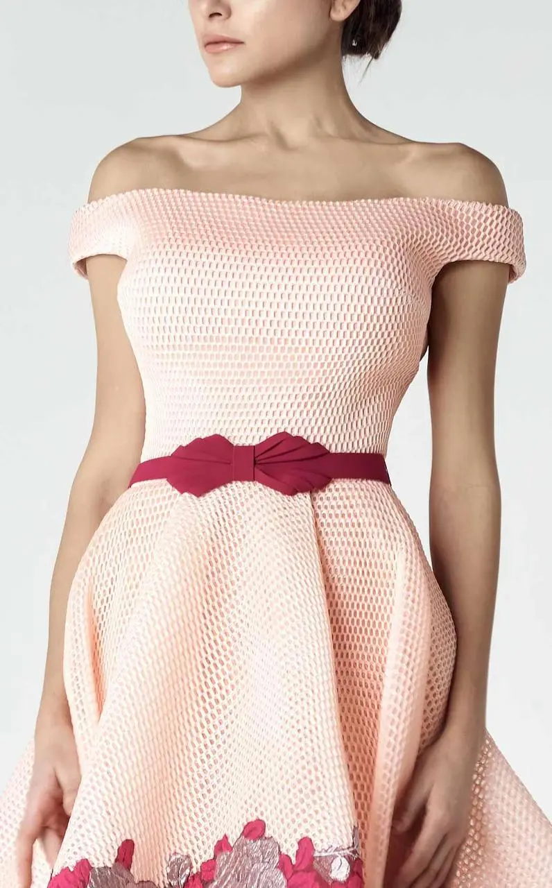 | Details: | Off-shoulder sleeves, Bow details on waistline, Floral applique embellishment |
