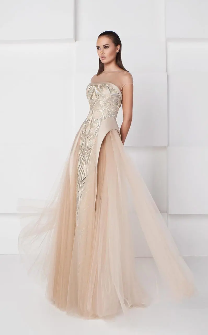 Make magic in this fantastic gown from SK by Saiid Kobeisy RE2781.The illusion bateau neckline bodice has sheer cap sleeves and will embrace your shape in glistening patterned fabric. Stunning details at the hips form curves as this bewitching ensemble flutters to the full-length hem. Saiid Kobeisy is designed with sophistication in mind; it is your perfect choice for prom, pageant or any special event. Model is wearing Gold color.