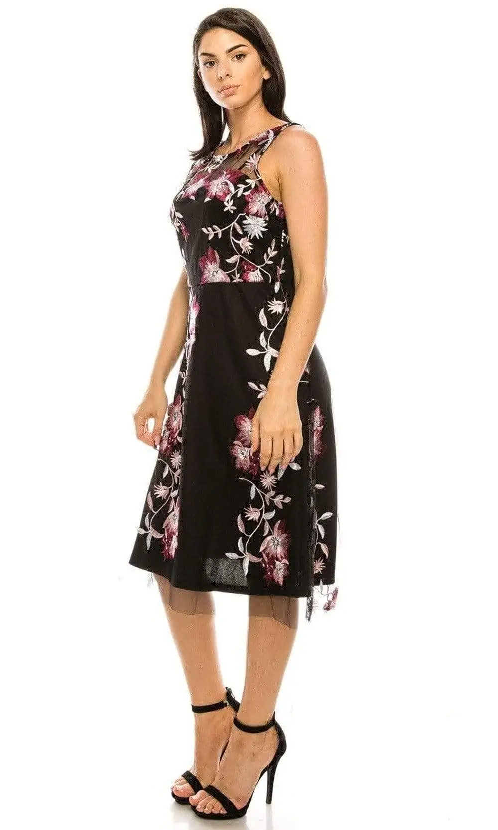 SD Collection 13640 is gorgeous tulle A-Line day to dinner dress with allover floral embroidery accent, showcasing an illusion neckline, sleeveless bodice and a partially sheer back with keyhole. The dress has hidden back zipper and finishes with a slip lined skirt and sheer hem that finishes at below the knee length.