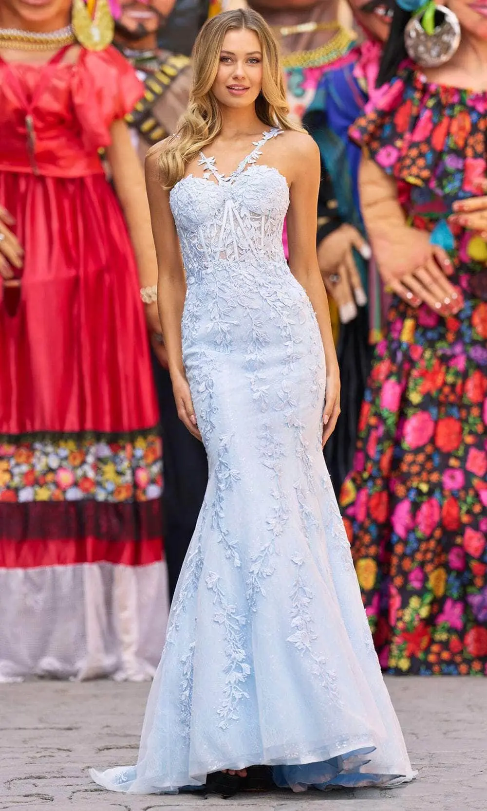 Match the twinkling quality of the stars in this gorgeously embellished Sherri Hill 55347 creation. Flatteringly ornamented with floral embroidered details accenting the semi-sheer corset bodice, this impeccable piece shows a halter neckline with ornate straps. Flaunting a midrise back with a concealed zipper closure, the embellished mermaid skirt sculpts and flares down into a trailing train. Glow with a stunning ultra-chic style in this Sherri Hill masterpiece. Model is wearing the Light Blue color.
