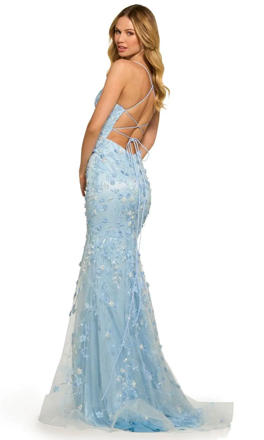 Show off your classy style when you wear this elegant Sherri Hill 55531 style. Stunning in satin, this floor length evening gown highlights your feminine grace in a sheer overlay detailed with elegant beadwork. Dainty floral appliques add a three-dimensional look, while wire-thin shoulder straps look nearly invisible against the skin. A V-neckline and a strappy open back add a daring touch to this elegant ensemble. This Sherri Hill 55531 masterpiece is tailored to fit your curves. Model is wearing Light Blue color.