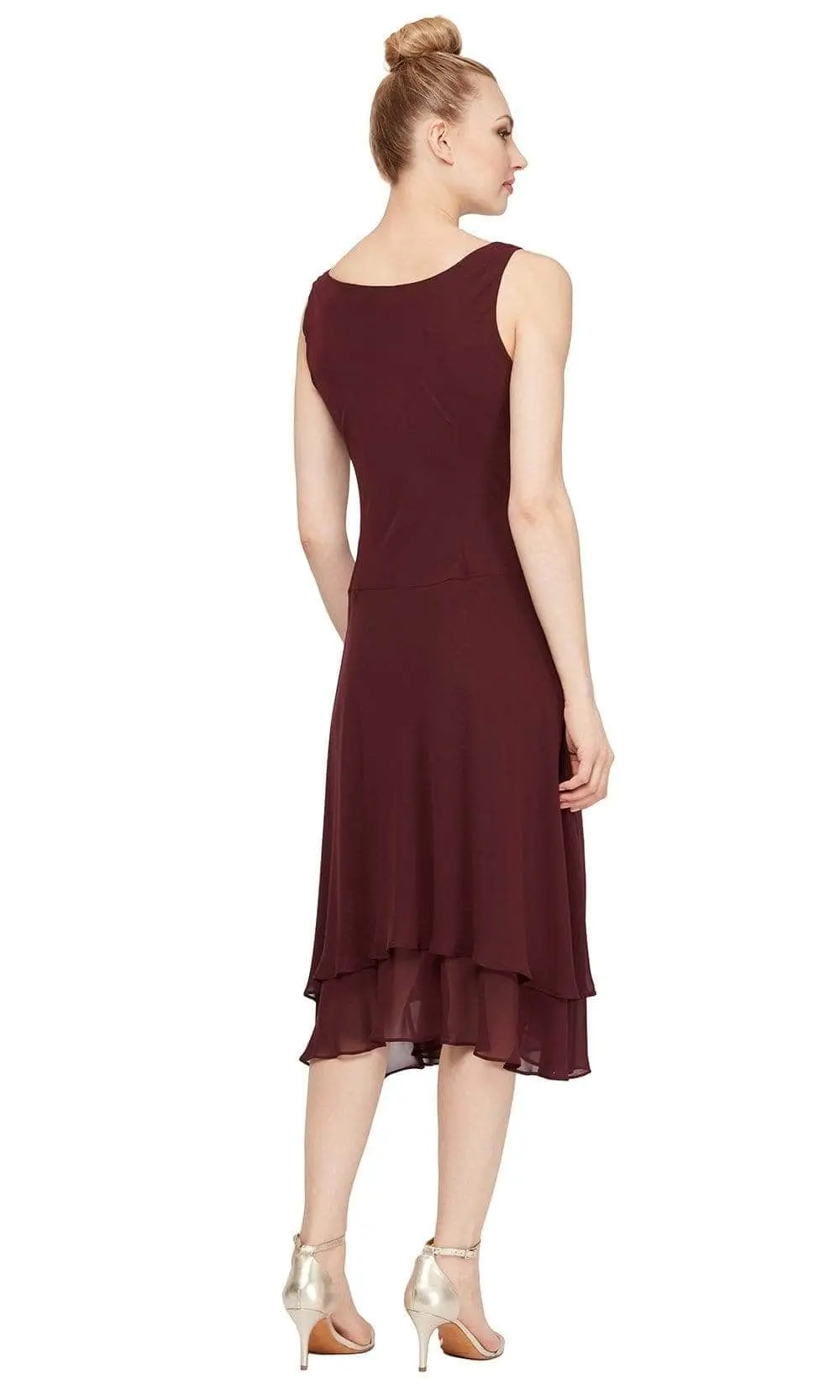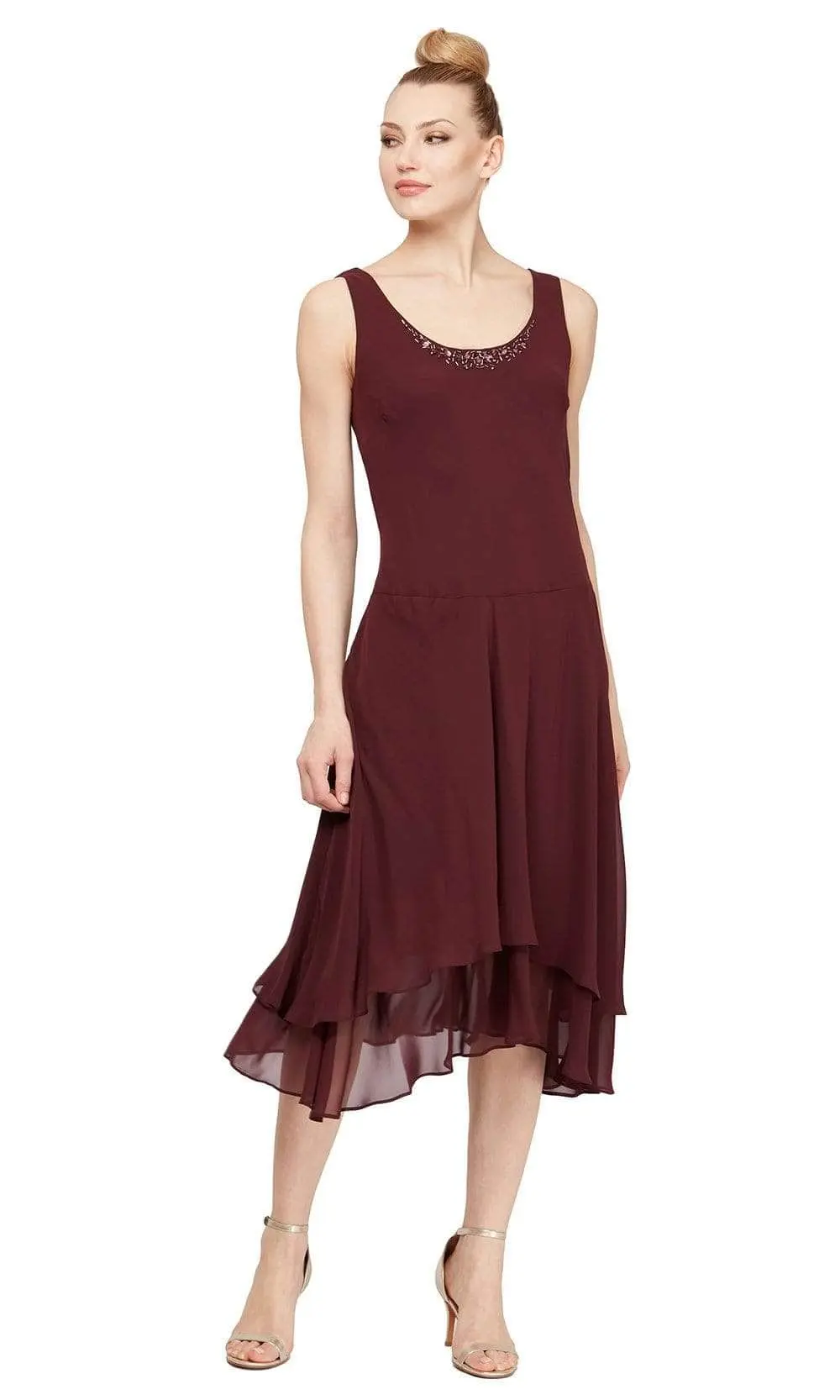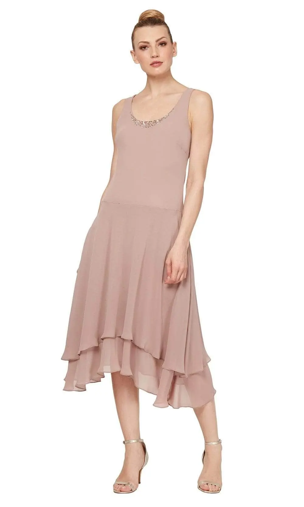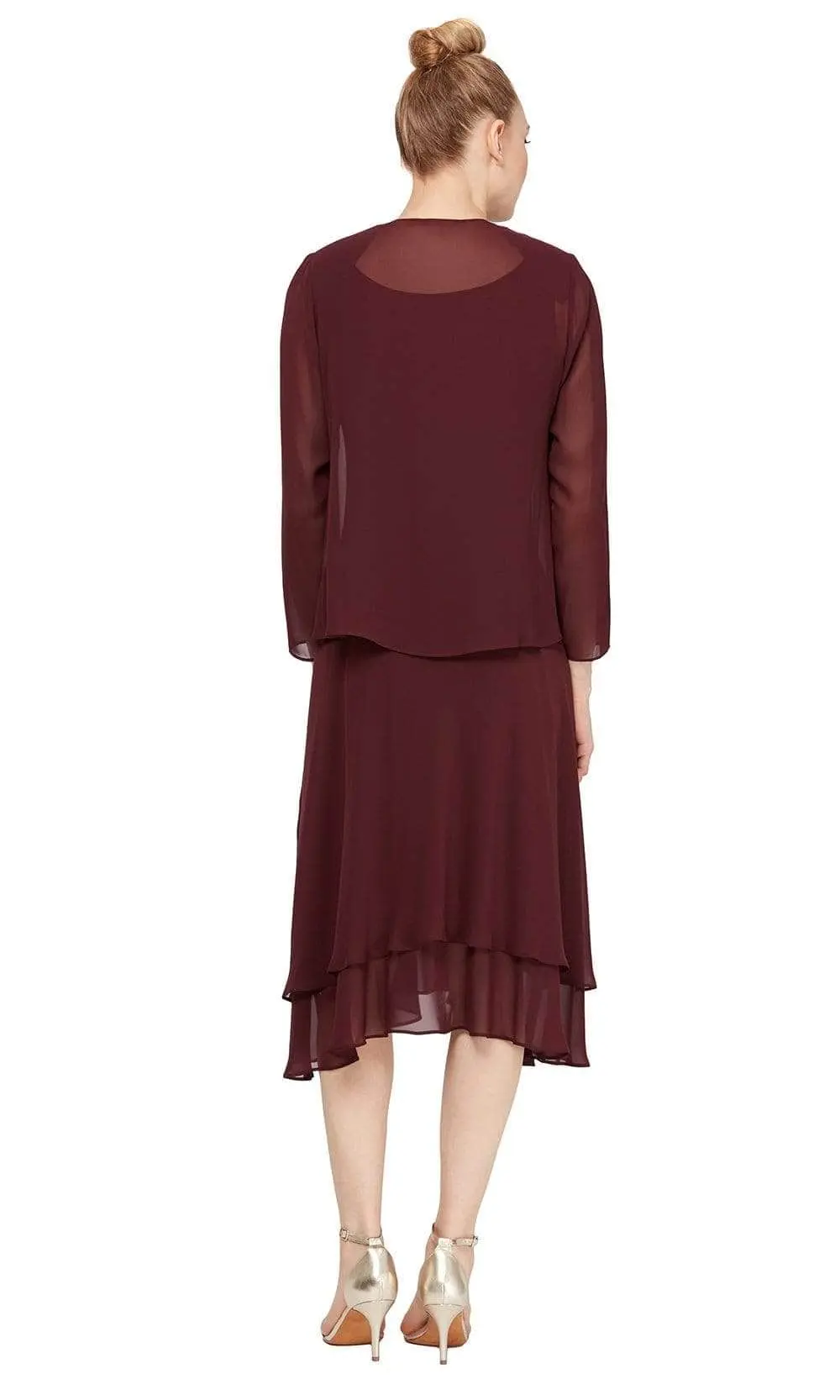 Make your night one to remember with this SLNY 116184 creation. Fashioned with ethereal chiffon, this dress features a beaded scoop neckline and scoop back. Nipped with a natural waistband, the skirt flares into a tiered high low hemline. Beadwork accents the shoulders as this long sleeve jacket completes this ensemble. You’ll look fantastic in photos with a beautiful dress from SLNY 116184. Models are wearing the Black, Cashmere, Navy, Steel, Fig and Mid Teal colors.