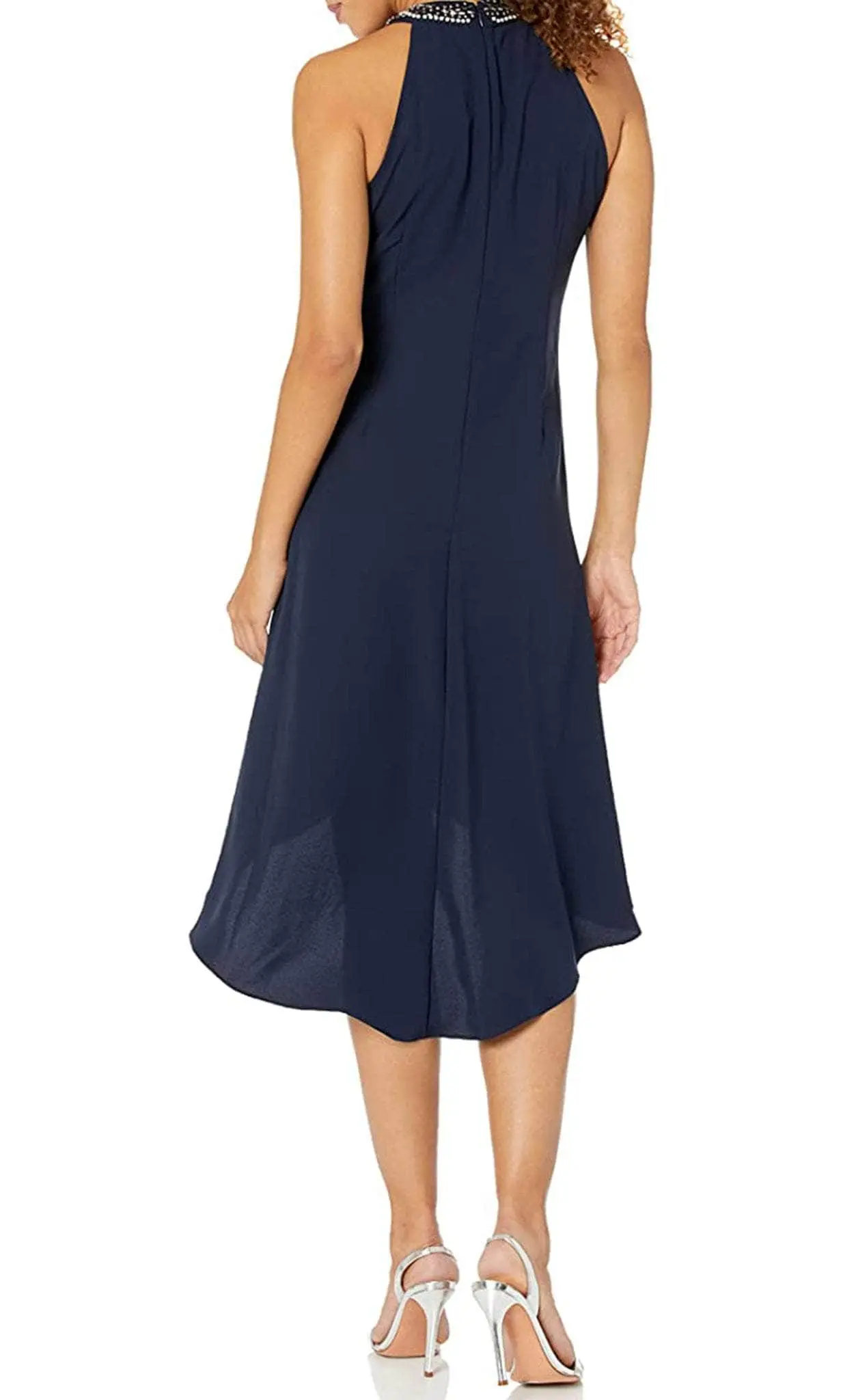Step out in style wearing this stunning dress from SLNY 419005. This style has a soft ruching and front draped design at the front which adds more elegance to the dress. The sleeveless also highlights a halter neckline with a beaded embellished collar, and a full back secure by a zipped up closure. Flaunting a high low hem, the skirt flares a glamorous A-line silhouette. This SLNY 419005 creation gives you an intricate look that will last a lifetime. Model is wearing the Navy color.
