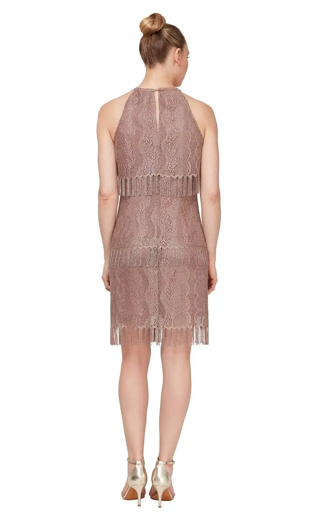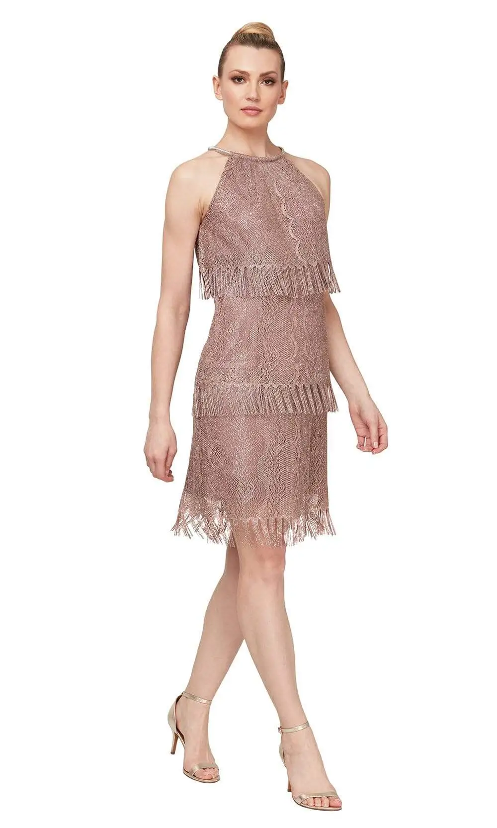 This enchanting SLNY is sure to make you the center of everyones attention. Dance to the music as you wear this dancing glittered lace dress. It features halter neckline and has tiered and dangling bodice with column silhouette into the knee length.
