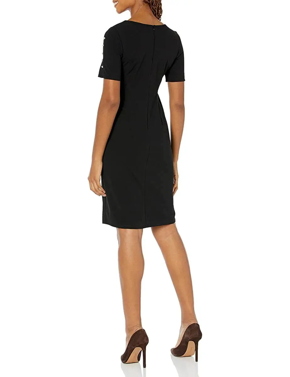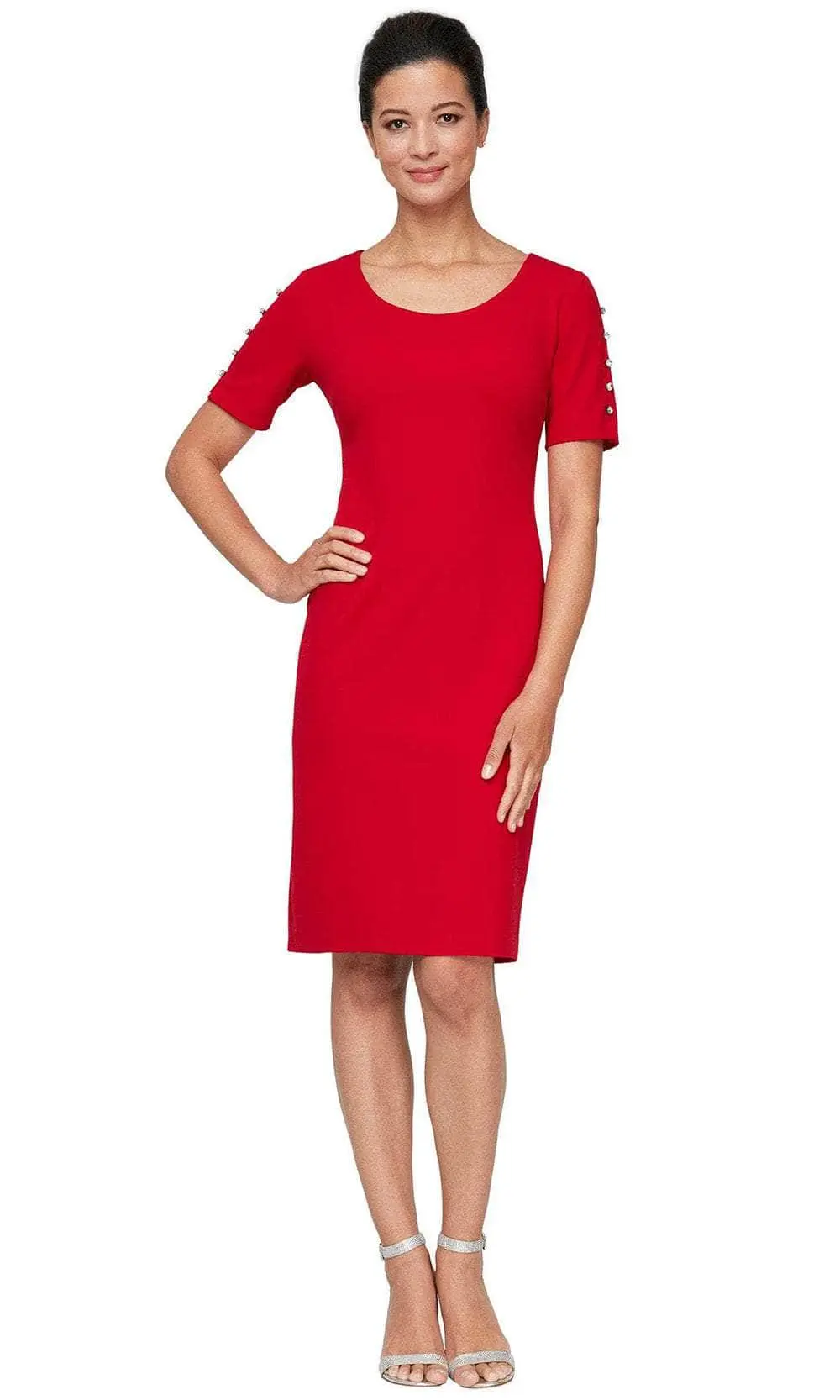 Look lovely in this chic dress by SLNY 9137181. This short dress glams in a scoop neckline with short sleeves with sparkling stud accents. It has a back zipper closure with visible seam for a more fitting look and is tailored with a mid-thigh sheath skirt. This SLNY dress is sure to be both comfy and fashionable. All the pieces under SLNY by Alex Evenings are eye-catching, and all of them can attract anyone in an instant. Uncover and witness the chic collection of all the designs and styles in the SLNY dresses for petite, missy and plus sizes, only from Couture Candy. Models are wearing Black, Cobalt and Red colors.