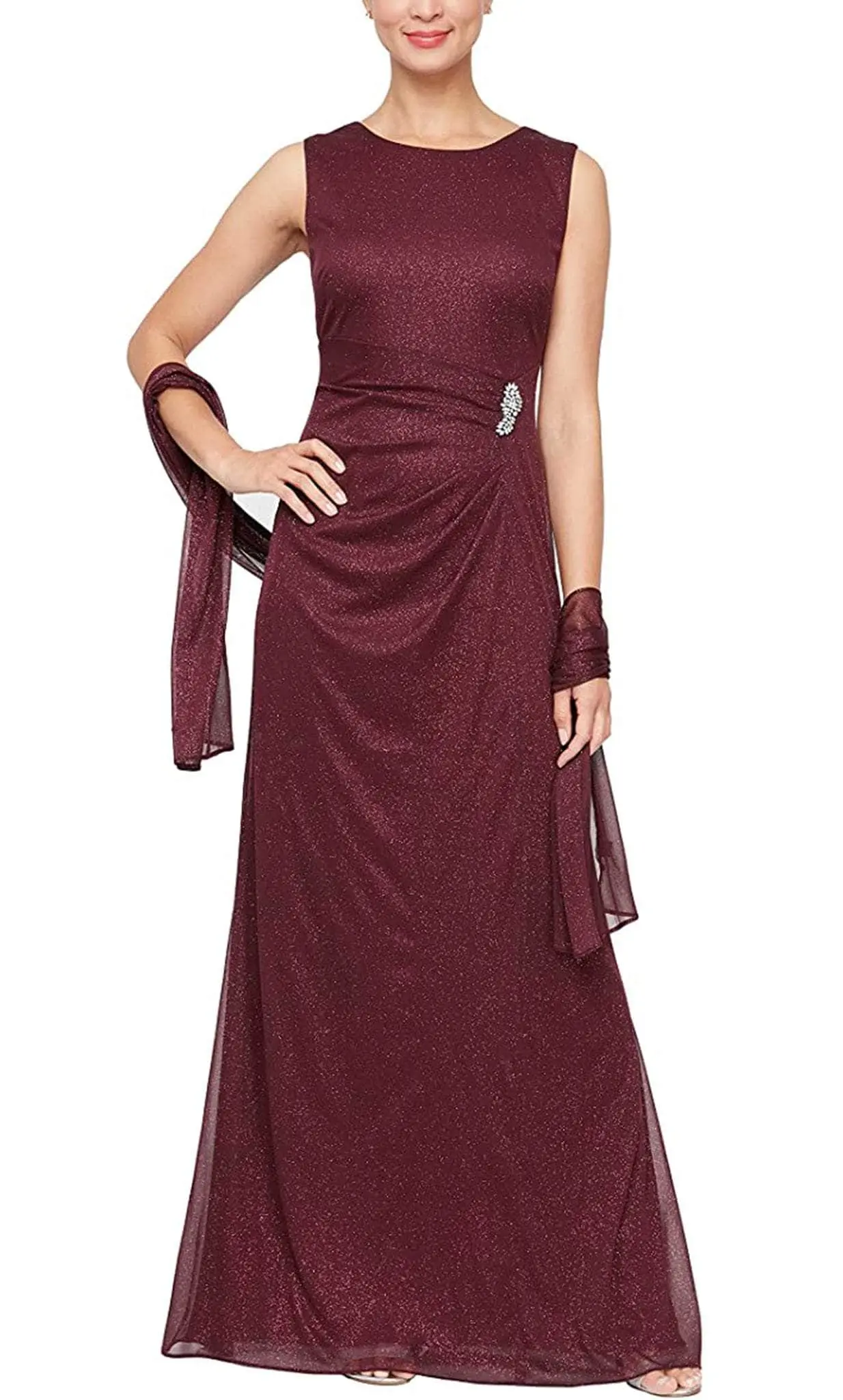 Astound everyone with your remarkable presence while wearing this SLNY 9233148 masterpiece. This gorgeous sleeveless gown boasts a jewel neckline, a fully closed back and a ruched waistline with an elegant brooch accent at the side. The skirt showcases a sheath silhouette as it glides down to a full length hem. A matching shawl is added to this outfit for a dramatic flair. Fall in love when you slip on this SLNY 9233148 evening gown. Models are wearing the Dark Navy and Fig colors.