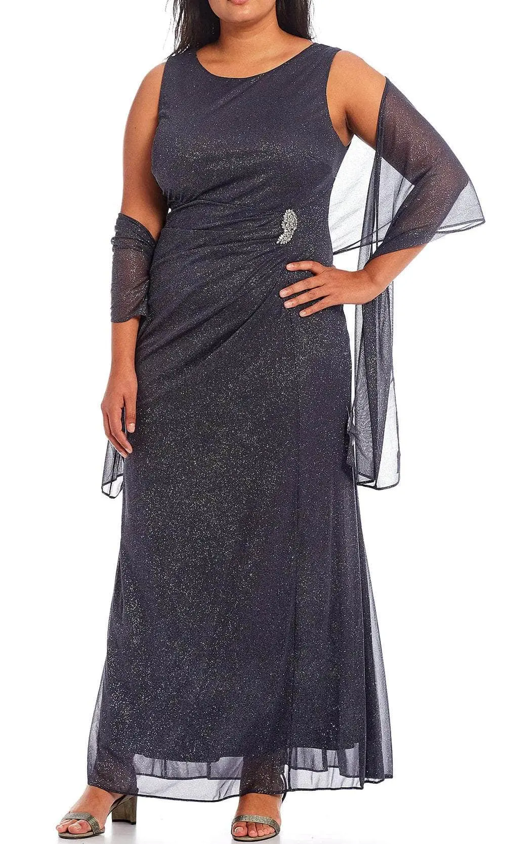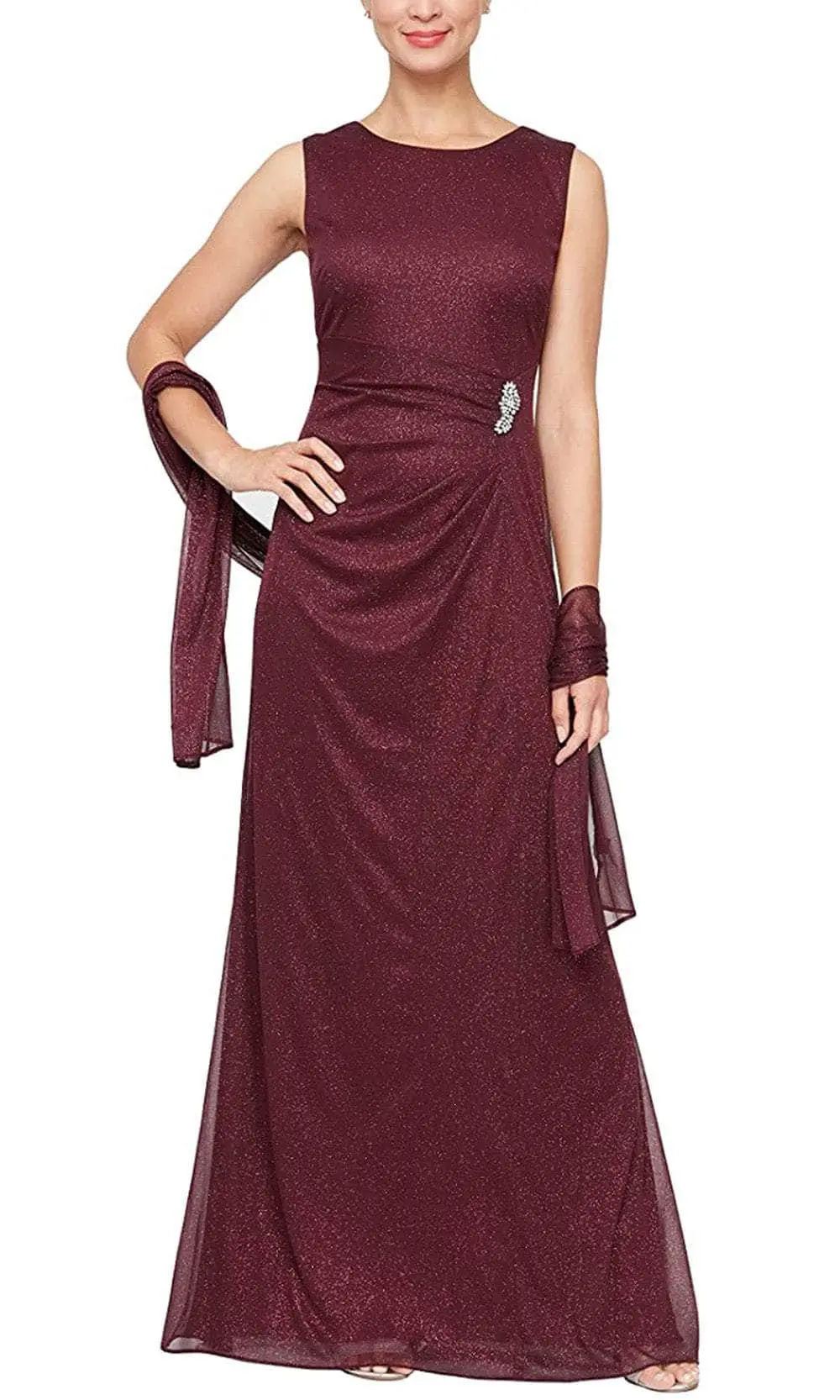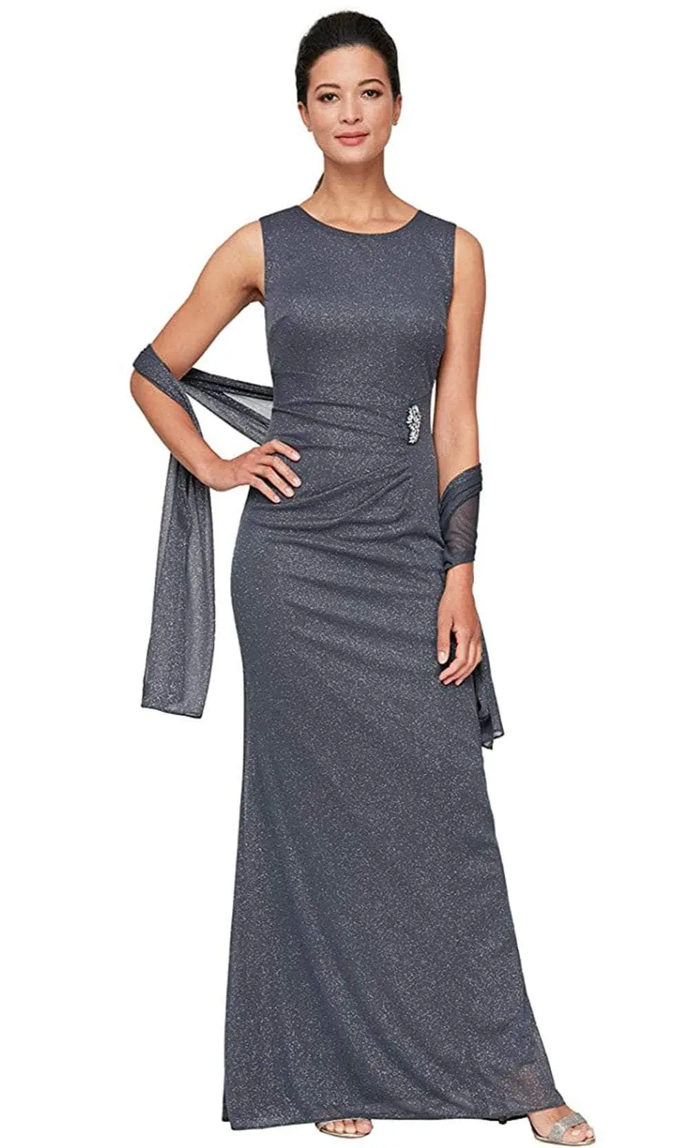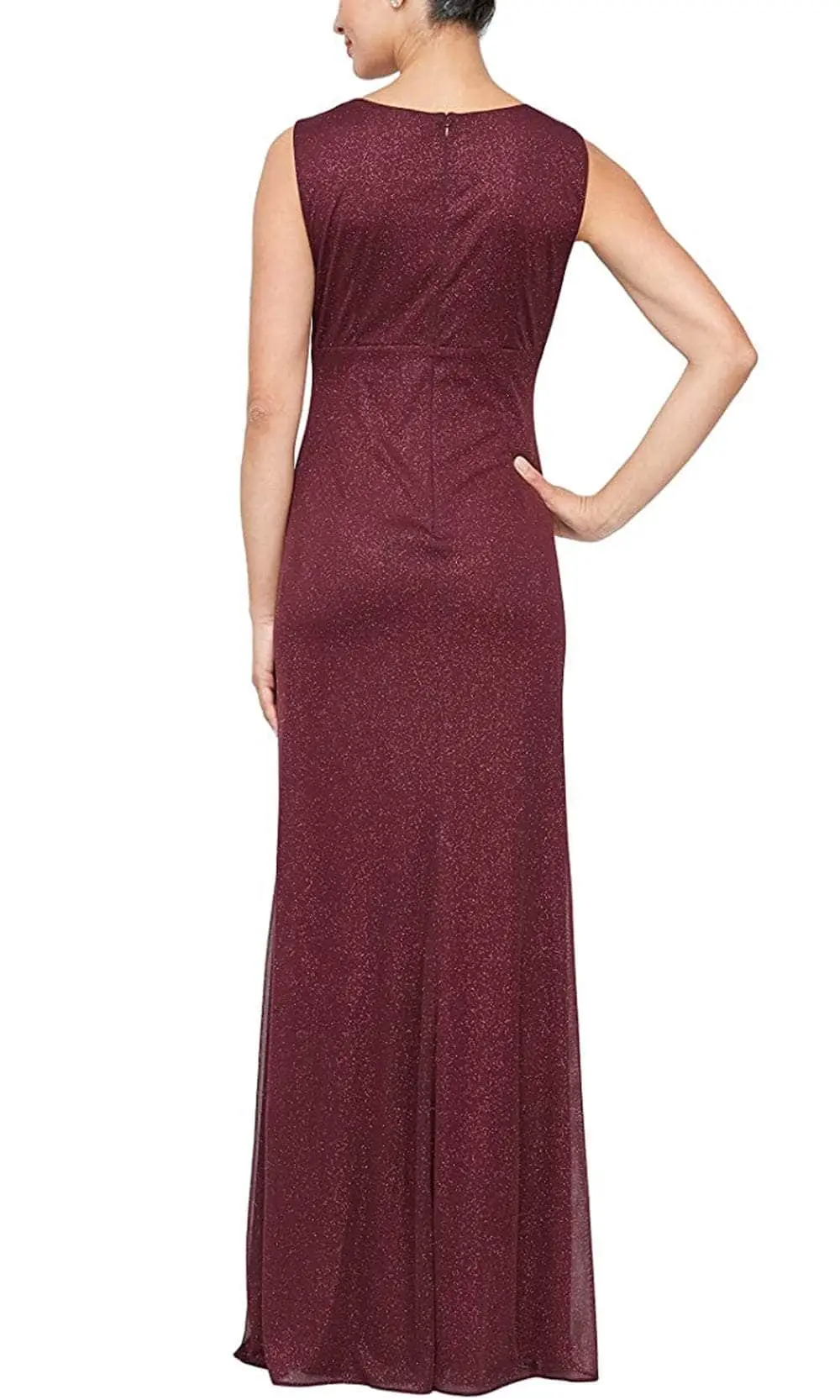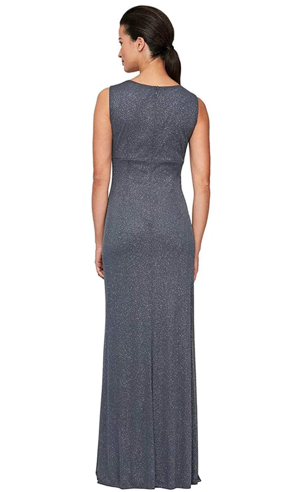 Reveal yourself as a total stunner in this impeccable SLNY 9433148 creation. Detailed with tailoring lines on a shimmering glitter silhouette, this chic, piece reveals a jewel neckline coupled with a full back with a concealed zipper closure. Flaunting soft drapes, the sheath skirt columns languidly into a floor grazing hemline. Dance all night long like a stunning vision in this exquisitely styled SLNY masterpiece. Models are wearing the Dark Navy, Fig, and Smoke colors.