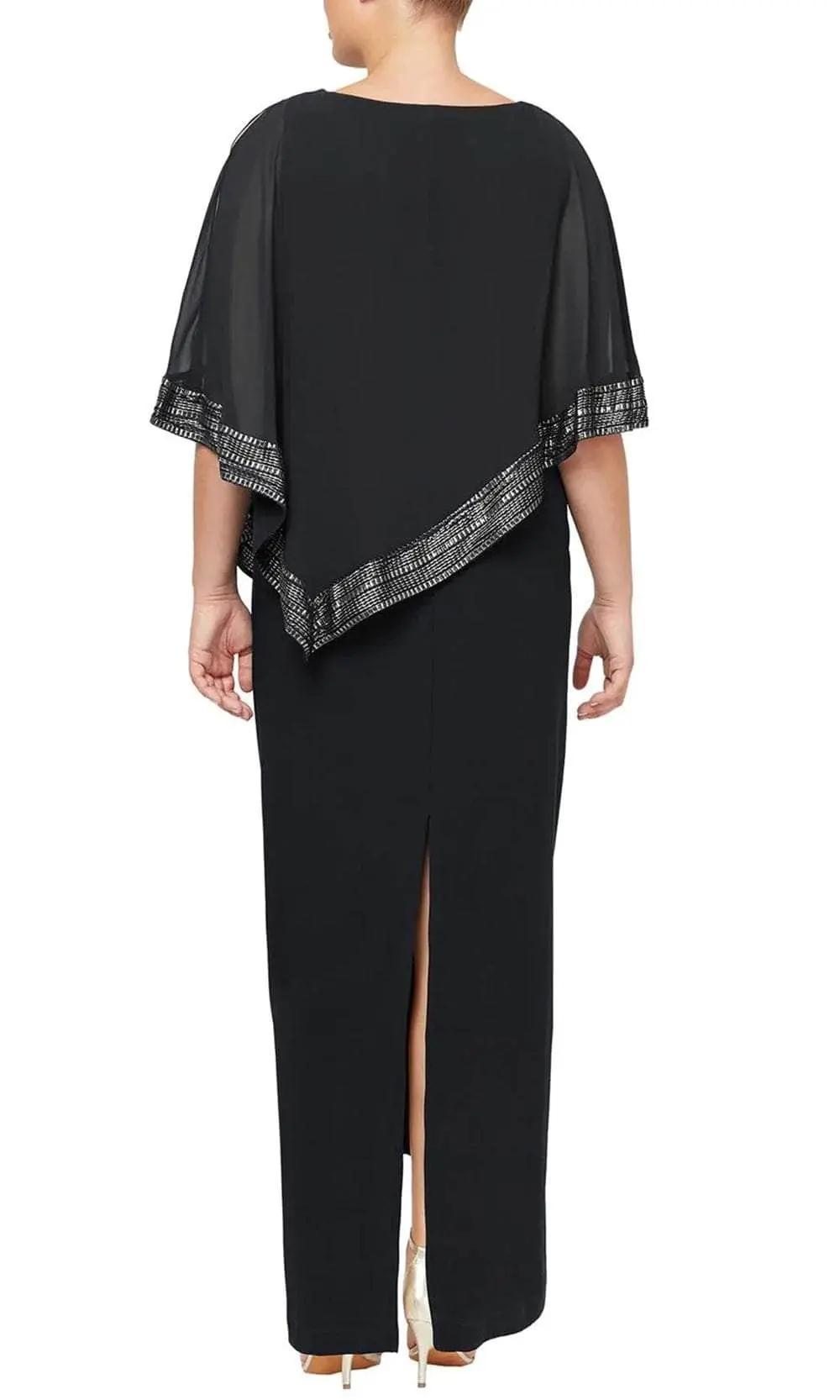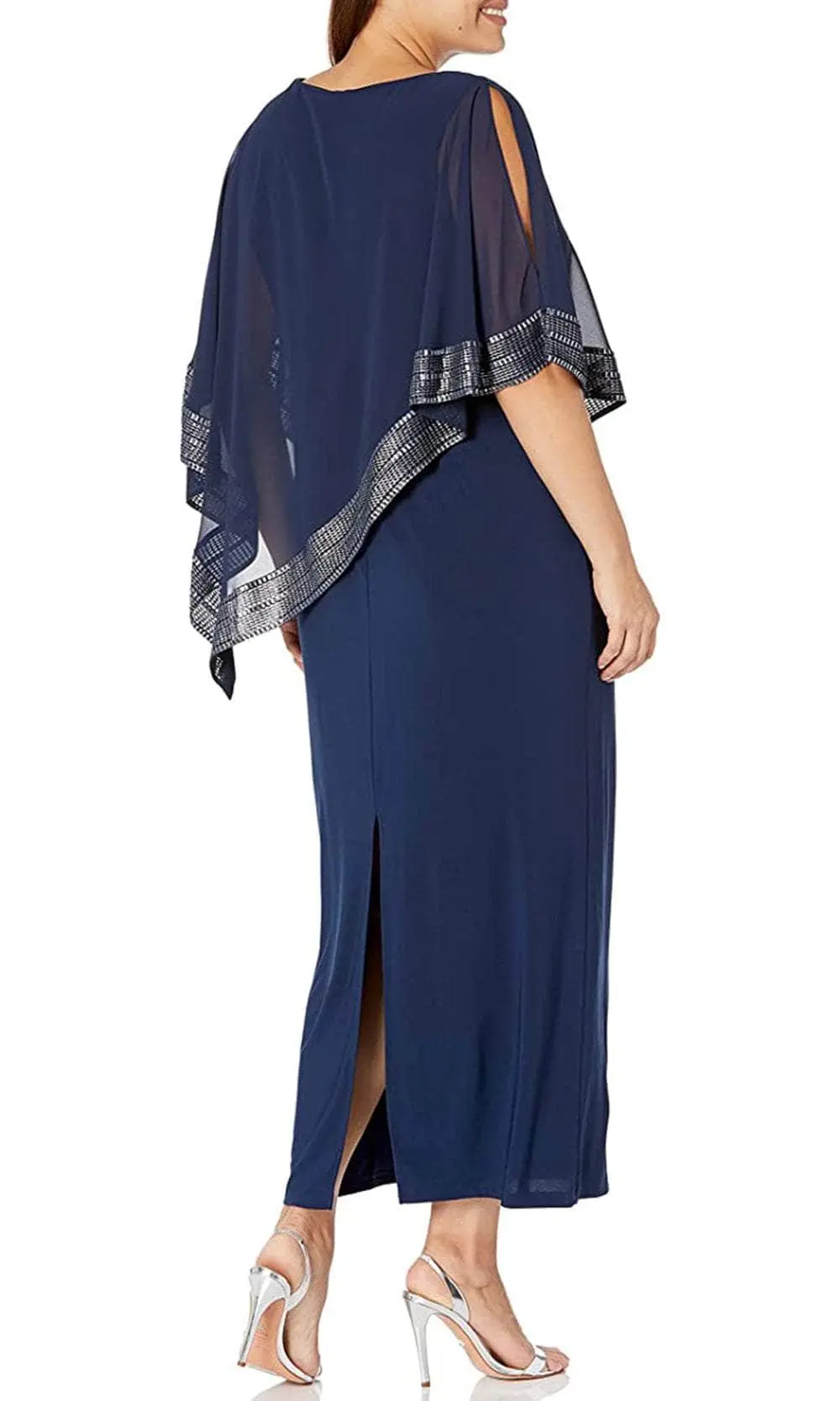 Breathe verve of allure while flaunting a romantic style in this SLNY 9470329 creation. Exceptionally designed with a tailored lining for the figure flattering form, this stylish piece parades a jewel neckline and a full back. Graced with an asymmetrical hemmed capelet trimmed with an exquisite metallic foil design, this ensemble reveals a cold shoulder accent. The sheath skirt parts with a slit as it stunningly ends with a floor hovering hem. Showcase a style that speaks of opulent flair in this SLNY masterpiece. Models are wearing the Black Silver, Deep Navy, and Fig colors.