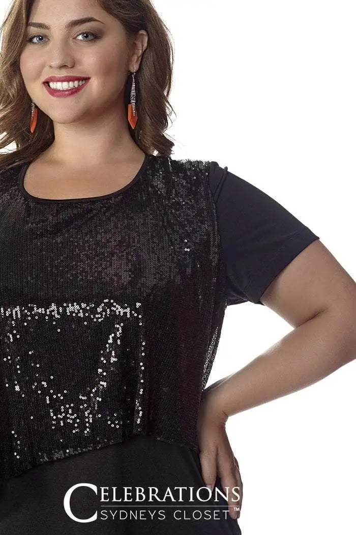 Shine when you wear our Little Black Dress to any special event. Perfect fashion choice for cocktails, dinner or dancing. Stretch knit fabric skims your curves. Asymmetrical sequin overlay adds just the right amount of sparkle for day or night. Sexy side slit on knee-length skirt. Wear it in the warm weather with sandals. Dress to impress the boss at the holiday party with a pair of high heels. Make your look more playful by adding a pop of color to the shoes or purse you pair with this dress. We’re thinking red shoes make the perfect choice for holiday parties