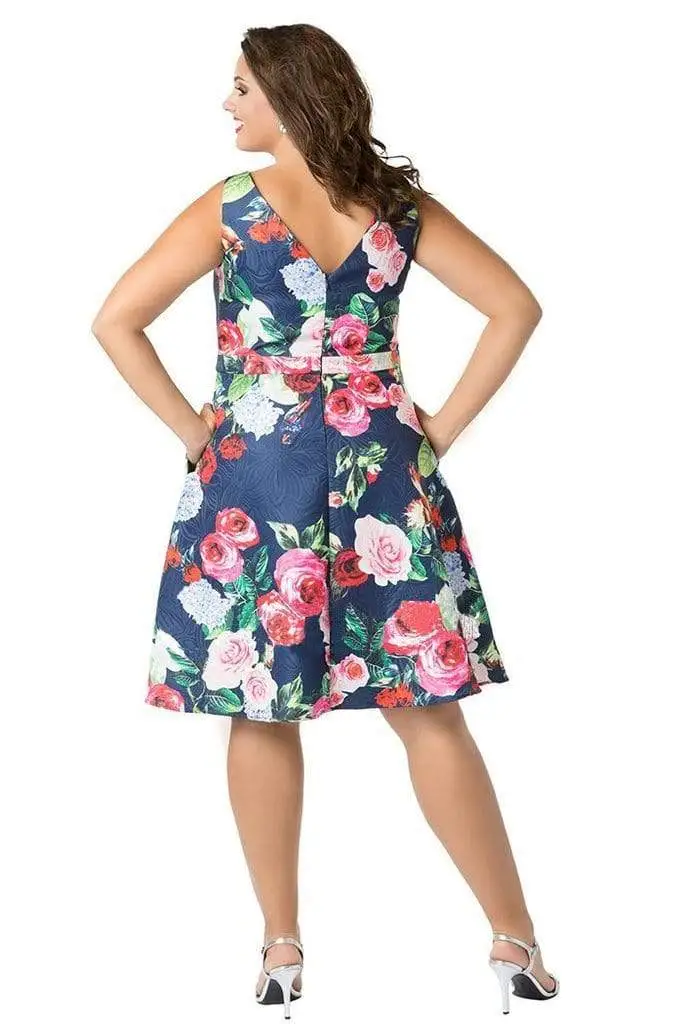 Take the flowers to the party, literally and figuratively, in this satin, knee-length party dress by Sydney?Æs Closet CE1806. The sleeveless V-bodice and V-neckline with illusion mesh net certainly puts you in the mood to party. The A-line skirt is styled with eye-catching floral prints and is accented with pockets. The skirt runs at knee length hem. Bloom with loveliness in this detailed dress from Sydney?Æs Closet.
