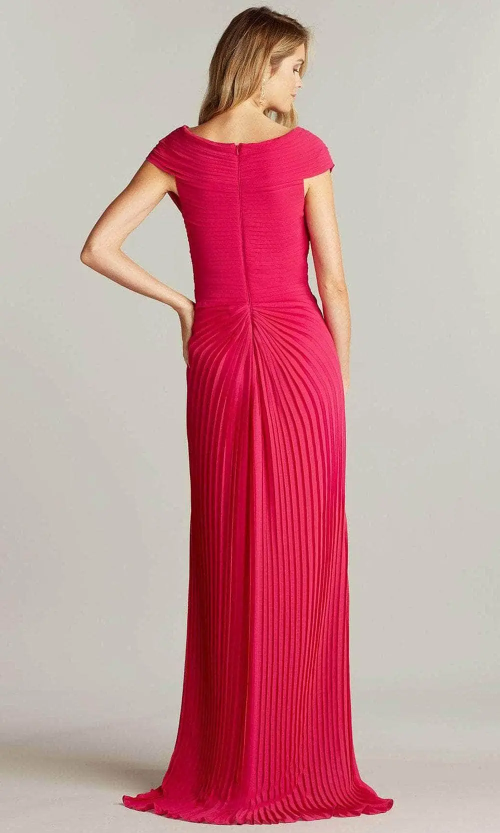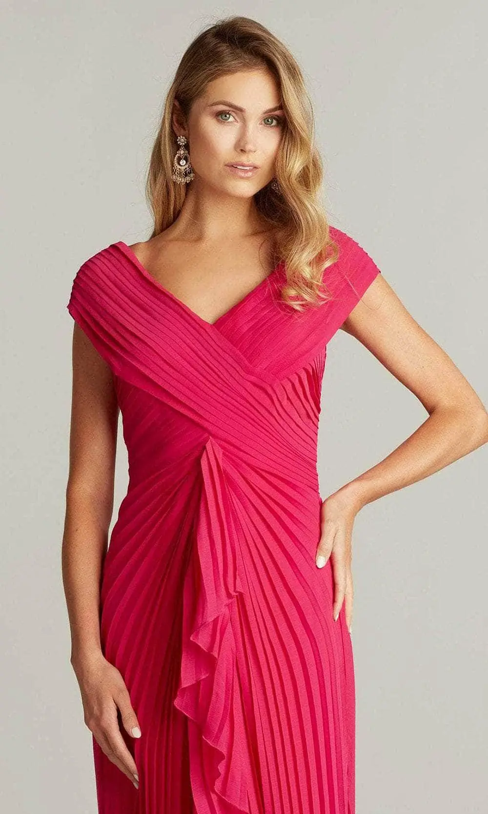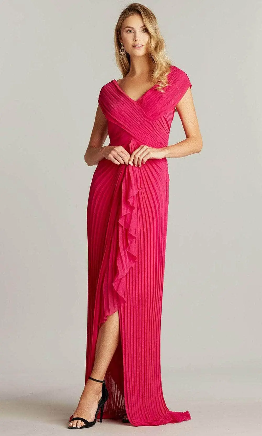 Be the center of attention in this glamorous Tadashi Shoji 8J22070L creation. Designed with intricate pleats on the crinkle chiffon fabric, this amazing gown flaunts a crisscrossed bodice with a V-neckline, cap sleeves and fully closed back. Draped with a cascading ruffle over its sexy front slit, the skirt parades a full length sheath silhouette with a sweeping train finish for added charm. Fascinate the crowd wearing this exceptional Tadashi Shoji masterpiece. Model is wearing the hibiscus color.