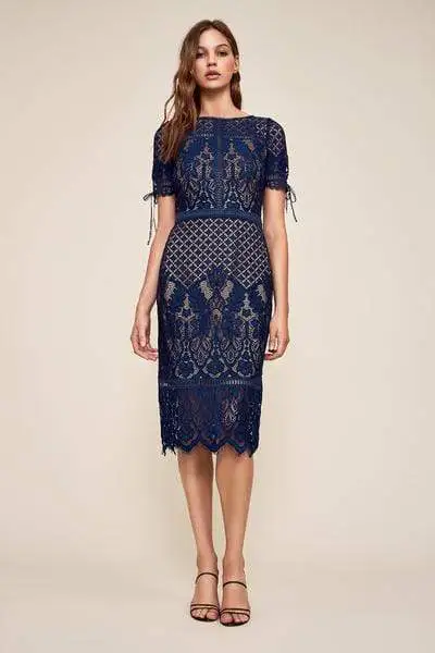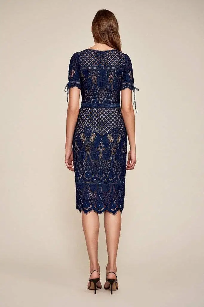 This lace applique dress charms in a bateau neckline with short sleeves styled with ties. The fitted bodice gives way to a knee length sheath skirt with a zigzag hemline.