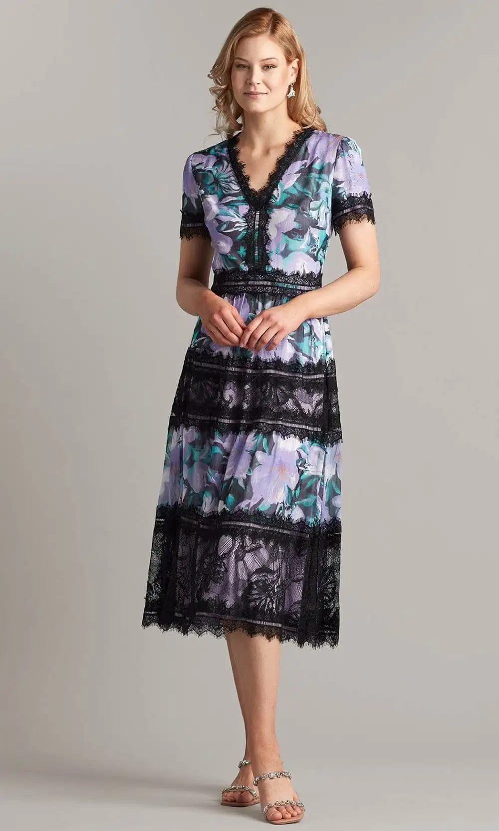 Dress to impress with this stylishly designed Tadashi Shoji BUH20506MD creation. Exceptionally tailored in stunning floral rendered jersey with trims of delicate lace, this dress features a v-neckline with lovely short sleeves. This dainty tea length dress features an A-line skirt that flares into a lace-trimmed hemline. Render a showstopping style in this fascinating Tadashi Shoji masterpiece. Stand out in the crowd with in Tadashi Shoji design with dresses that are meant to make women feel gorgeous, confident, and comfortable. Model is wearing the Lilac/Floral color.